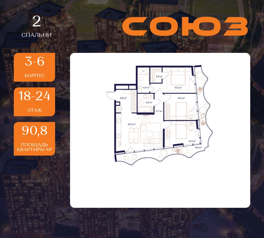 Рассрочка 0%Продаётся 3-комнатная квартира площадью 90.8 м² на 18 этаже в Жилом Комплексе «Союз».