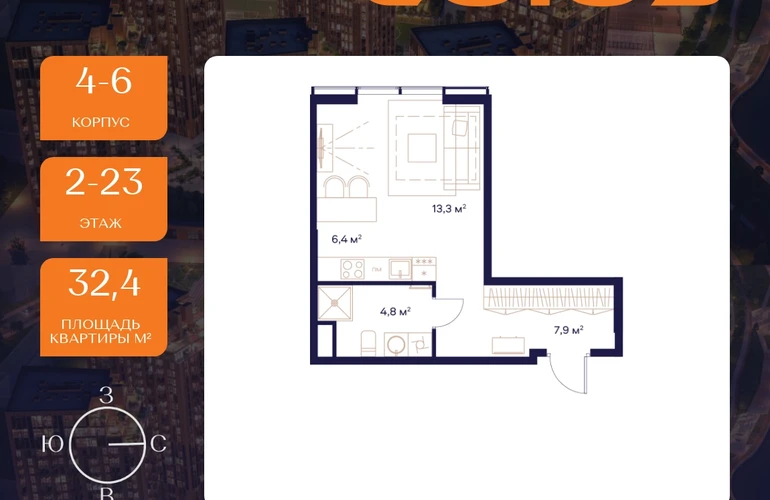 Продаётся квартира-студия площадью 32.4 м² на 2 этаже в Жилом Комплексе "Союз". Уникальный жилой спортивно-оздоровительный квартал с рекордным количеством олимпийских видов спорта, доступных жителям 24/7. Из 9 га застройки 7га отданы под спортивную инфраструктуру. В открытом доступе у жителей спортивно-оздоровительного кластера юности и здоровья: - Ледовая арена для хоккея и фигурного катания, - Футбольные поля для тренировок, - Спортивный зал для фехтования, - Бассейн на 6 дорожек, - Центр единоборств, - 4 крытых площадки для настольного тенниса, - 7 теннисных кортов (крытых и открытых), - 4 крытых площадки для сквоша, - Легкоатлетический стадион, - площадки для баскетбола и волейбола. На выбор будущим жильцам ЖК представляется 3 вида балконов, различные гардеробные и просторные холлы, продуманные планировочные решения с мастер-спальнями, кабинетами, санузлами, постирочными, а также панорамное остекление. Комплекс оснащен разнообразной собственной инфраструктурой. На территории ЖК есть зона для пикников, розарий, сосновые, каштановые и дубовые аллеи, площадки ворк-аута и йоги, а также ресторан «ШАБАДА» Сосо Павлиашвили с просторной прогулочной зоной с водными элементами, садом ароматных трав и открытой сценой. В благоустройство квартала входит закрытый и безопасный двор, фонтан, арт-объекты, световой дизайн, интерактивные площадки для детей разных возрастов. Рядом с Комплексом располагается большое количество локаций, способствующих активному времяпрепровождению: - Парк Будущего, - Леоновская роща, - Национальный парк, - Лосиный остров, - Парк Сокольники, - Главный Ботанический сад, - РАН, - ВДНХ, - Парк Останкино, - Парк Свиблово, - Пойма реки Яуза.О застройщике