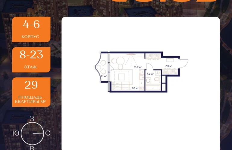 Рассрочка 0%Продаётся квартира-студия площадью 29 м² на 8 этаже в Жилом Комплексе «Союз».