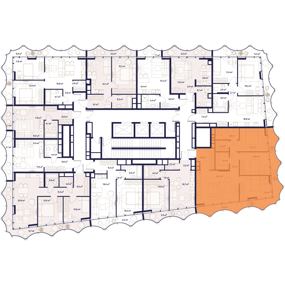 Уникальные форматы квартир с мастер-спальнями, приватными террасами, балконами, а также пентхаусы с открыточными видами на город.