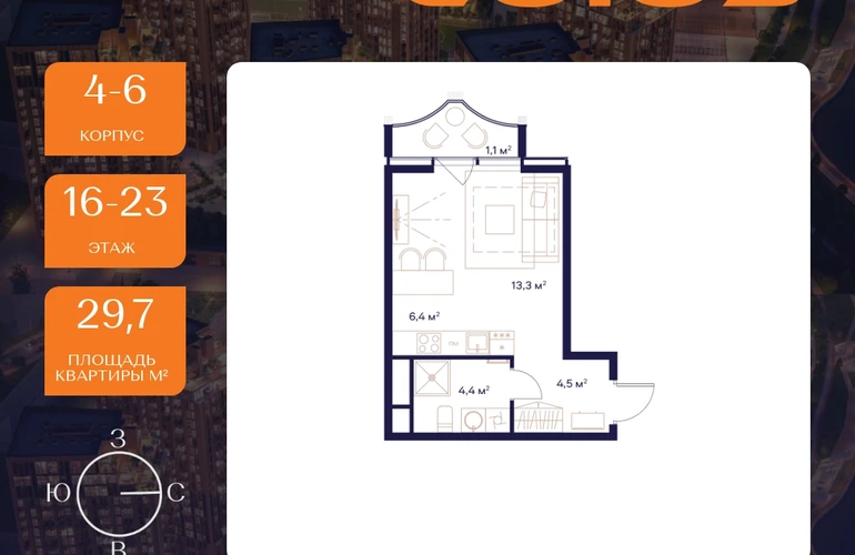 Рассрочка 0%Продаётся квартира-студия площадью 29.7 м² на 16 этаже в Жилом Комплексе «Союз».