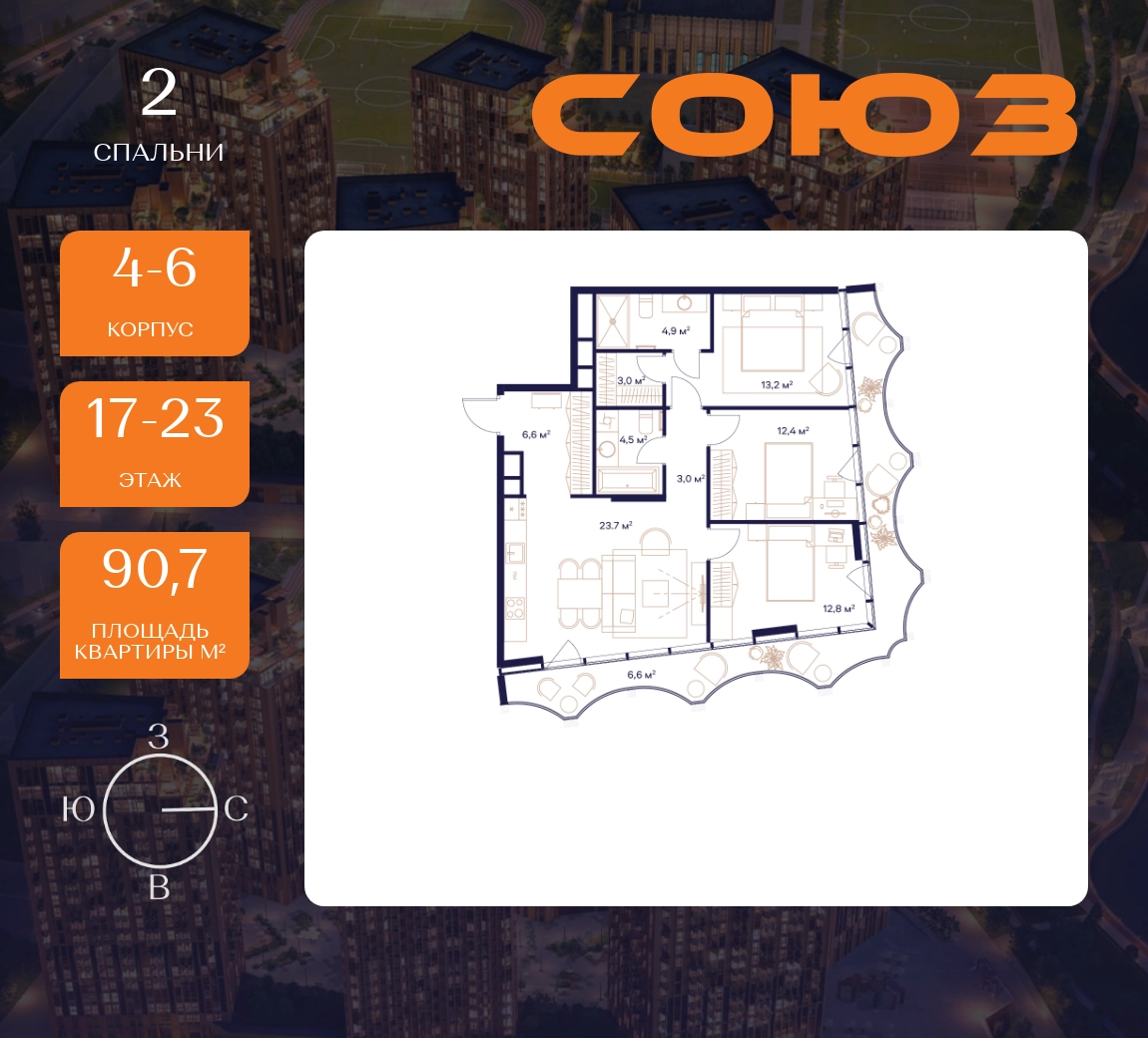 Продаётся 3-комнатная квартира площадью 90.7 м² на 17 этаже в Жилом Комплексе "Союз". Уникальный жилой спортивно-оздоровительный квартал с рекордным количеством олимпийских видов спорта, доступных жителям 24/7. Из 9 га застройки 7га отданы под спортивную инфраструктуру. В открытом доступе у жителей спортивно-оздоровительного кластера юности и здоровья: - Ледовая арена для хоккея и фигурного катания, - Футбольные поля для тренировок, - Спортивный зал для фехтования, - Бассейн на 6 дорожек, - Центр единоборств, - 4 крытых площадки для настольного тенниса, - 7 теннисных кортов (крытых и открытых), - 4 крытых площадки для сквоша, - Легкоатлетический стадион, - площадки для баскетбола и волейбола. На выбор будущим жильцам ЖК представляется 3 вида балконов, различные гардеробные и просторные холлы, продуманные планировочные решения с мастер-спальнями, кабинетами, санузлами, постирочными, а также панорамное остекление. Комплекс оснащен разнообразной собственной инфраструктурой. На территории ЖК есть зона для пикников, розарий, сосновые, каштановые и дубовые аллеи, площадки ворк-аута и йоги, а также ресторан «ШАБАДА» Сосо Павлиашвили с просторной прогулочной зоной с водными элементами, садом ароматных трав и открытой сценой. В благоустройство квартала входит закрытый и безопасный двор, фонтан, арт-объекты, световой дизайн, интерактивные площадки для детей разных возрастов. Рядом с Комплексом располагается большое количество локаций, способствующих активному времяпрепровождению: - Парк Будущего, - Леоновская роща, - Национальный парк, - Лосиный остров, - Парк Сокольники, - Главный Ботанический сад, - РАН, - ВДНХ, - Парк Останкино, - Парк Свиблово, - Пойма реки Яуза.О застройщике