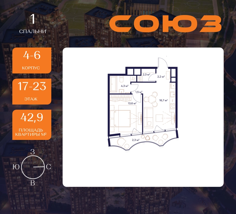 Рассрочка 0%Продаётся 1-комнатная квартира площадью 42.9 м² на 17 этаже в Жилом Комплексе «Союз».