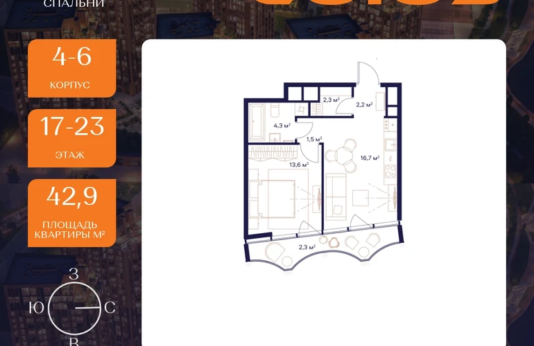 Рассрочка 0%Продаётся 1-комнатная квартира площадью 42.9 м² на 17 этаже в Жилом Комплексе «Союз».