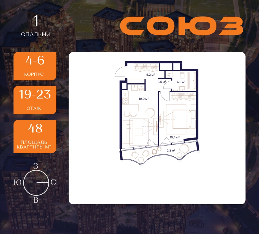Рассрочка 0%Продаётся 1-комнатная квартира площадью 48 м² на 19 этаже в Жилом Комплексе «Союз».
