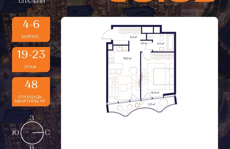Рассрочка 0%Продаётся 1-комнатная квартира площадью 48 м² на 19 этаже в Жилом Комплексе «Союз».