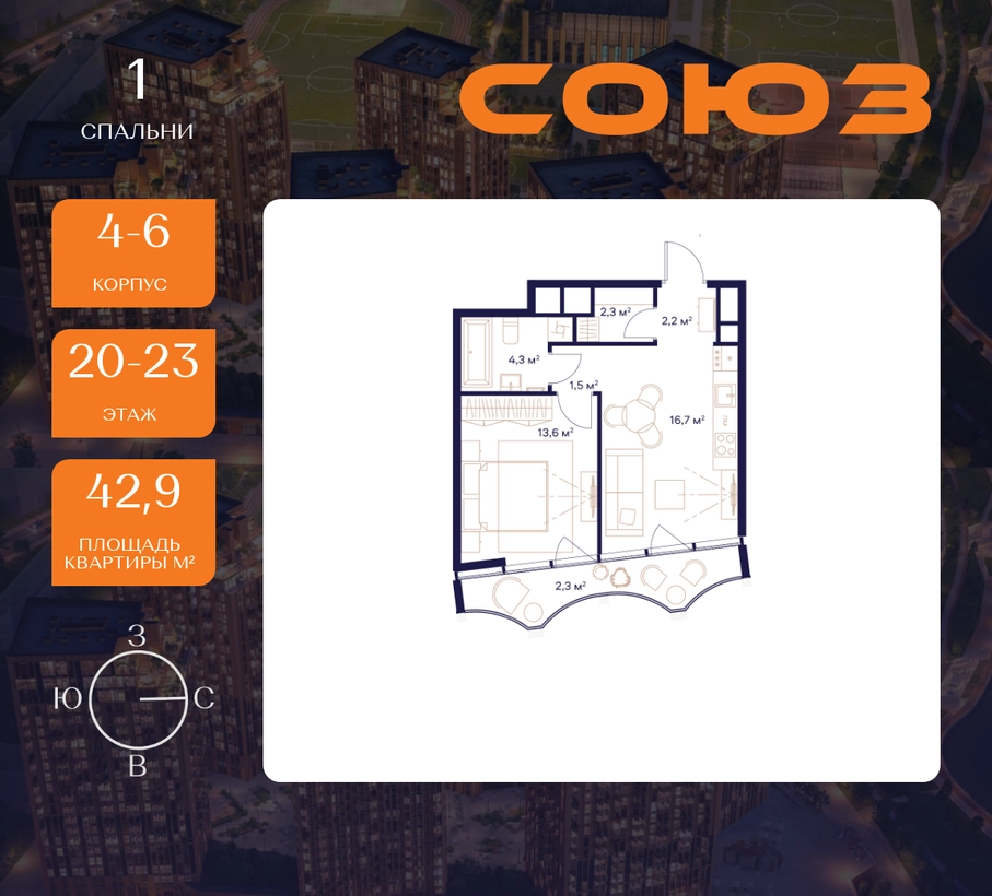Рассрочка 0%Продаётся 1-комнатная квартира площадью 42.9 м² на 20 этаже в Жилом Комплексе «Союз».