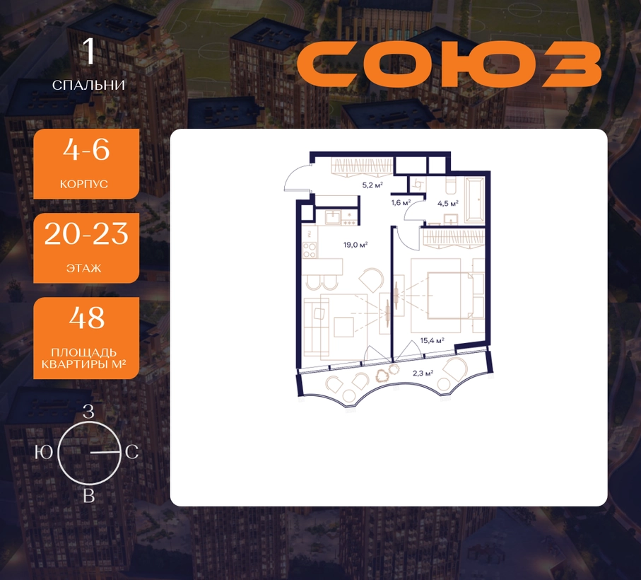 Рассрочка 0%Продаётся 1-комнатная квартира площадью 48 м² на 20 этаже в Жилом Комплексе «Союз».