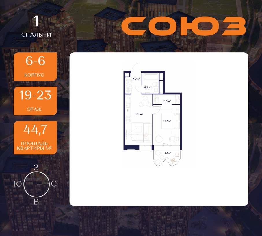 Рассрочка 0%Продаётся 1-комнатная квартира площадью 44.7 м² на 19 этаже в Жилом Комплексе «Союз».
