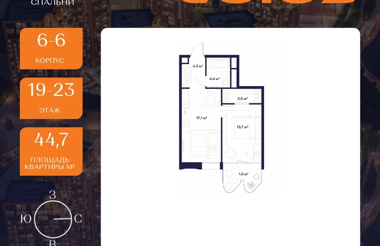 Рассрочка 0%Продаётся 1-комнатная квартира площадью 44.7 м² на 19 этаже в Жилом Комплексе «Союз».
