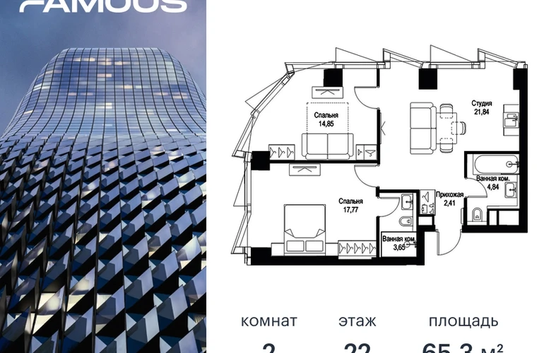 Прямая продажа от застройщика. Продаётся 2-к квартира общей площадью 65.34 кв. м с предчистовой отделкой на 22-м этаже премиального небоскреба Famous. Срок ввода в эксплуатацию - IV кв. 2024 г. Выдача ключей - II кв. 2025 г. Если к слову «будущее» подобрать архитектурный синоним, им непременно станет премиальный небоскреб Famous. Он расположен в закрытом квартале «Фили Сити» – настоящем городе в городе, окруженном зеленым ореолом из аллей и скверов, с инфраструктурой для жизни и отдыха самых взыскательных горожан. Резидентов Famous ждет особая привилегия – открывающиеся из окон бескрайние панорамы, с видами на парк Фили, Поклонную гору, Москва-реку и Москва-Сити. Эффектный ультрасовременный 57-этажный небоскреб, пластичный в нижней части, наверху трансформируется и взмывает ввысь выразительной скульптурой с обтекаемой поверхностью. Фасад украшенный стеклянными эркерами в виде прямых треугольных призм, словно олицетворяет собой идеально собранный пазл. Это безупречное решение для тех, кто не боится лидерства и высоты, не ищет простых путей, держит высокую планку во всем, не останавливается на достигнутом и живет в ритме мегаполиса. Не зря логотип Famous украшает графический элемент Триумфальной арки на Кутузовском проспекте – символ успеха и жизненных побед. Особенности дома: • Проект премиум-класса рядом с центром Москвы • Футуристическая авторская архитектура от бюро ADM • Ультрасовременные инженерные решения современных небоскрёбов • Элегантное решение орнаментальной композиции фасада от бюро ADM • Famous станет первым проектом в Москве с интерьерами лобби от международной архитектурной компании A ++ • Панорамное остекление по всему фасаду, головокружительные виды на достопримечательности Москвы, парк Фили, Москва-Сити и Поклонную гору • Европейский подход к благоустройству: площадь с фонтанами, парк-променад, детские и спортивные площадки, зоны отдыха • Продуманная концепция инфраструктуры: уютные кафе и рестораны, супермаркет, фитнес-студия, службы сервиса, детский центр развития • Эргономичные планировки от бюро Олега Клодта Транспортная доступность: • Удобный выезд на Кутузовский проспект и ТТК • В пешей доступности станции метро «Фили», «Багратионовская» и «Парк Победы» Компания MR Group предлагает своим клиентам специальные условия приобретения квартир в рамках программ ипотечного кредитования от банков-партнеров.О застройщике