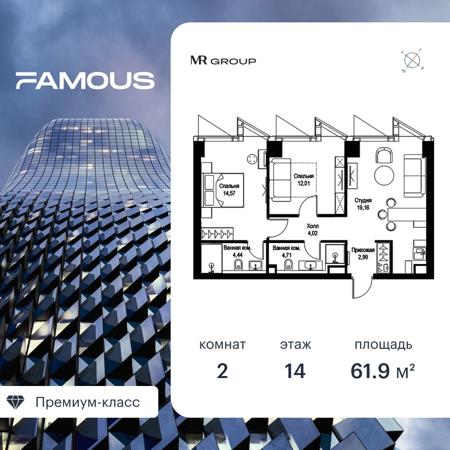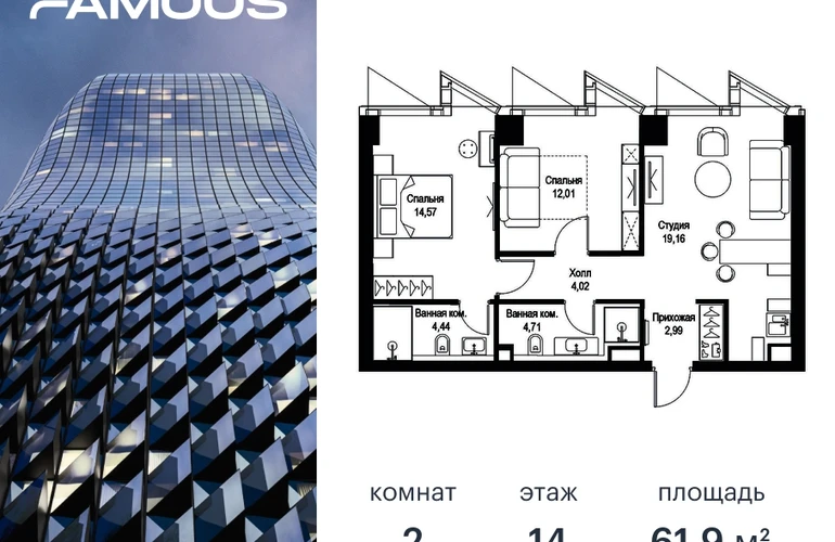 Прямая продажа от застройщика. Продаётся 2-к квартира общей площадью 61.90 кв. м с предчистовой отделкой на 14-м этаже премиального небоскреба Famous. Срок ввода в эксплуатацию - IV кв. 2024 г. Выдача ключей - II кв. 2025 г. Если к слову «будущее» подобрать архитектурный синоним, им непременно станет премиальный небоскреб Famous. Он расположен в закрытом квартале «Фили Сити» – настоящем городе в городе, окруженном зеленым ореолом из аллей и скверов, с инфраструктурой для жизни и отдыха самых взыскательных горожан. Резидентов Famous ждет особая привилегия – открывающиеся из окон бескрайние панорамы, с видами на парк Фили, Поклонную гору, Москва-реку и Москва-Сити. Эффектный ультрасовременный 57-этажный небоскреб, пластичный в нижней части, наверху трансформируется и взмывает ввысь выразительной скульптурой с обтекаемой поверхностью. Фасад украшенный стеклянными эркерами в виде прямых треугольных призм, словно олицетворяет собой идеально собранный пазл. Это безупречное решение для тех, кто не боится лидерства и высоты, не ищет простых путей, держит высокую планку во всем, не останавливается на достигнутом и живет в ритме мегаполиса. Не зря логотип Famous украшает графический элемент Триумфальной арки на Кутузовском проспекте – символ успеха и жизненных побед. Особенности дома: • Проект премиум-класса рядом с центром Москвы • Футуристическая авторская архитектура от бюро ADM • Ультрасовременные инженерные решения современных небоскрёбов • Элегантное решение орнаментальной композиции фасада от бюро ADM • Famous станет первым проектом в Москве с интерьерами лобби от международной архитектурной компании A ++ • Панорамное остекление по всему фасаду, головокружительные виды на достопримечательности Москвы, парк Фили, Москва-Сити и Поклонную гору • Европейский подход к благоустройству: площадь с фонтанами, парк-променад, детские и спортивные площадки, зоны отдыха • Продуманная концепция инфраструктуры: уютные кафе и рестораны, супермаркет, фитнес-студия, службы сервиса, детский центр развития • Эргономичные планировки от бюро Олега Клодта Транспортная доступность: • Удобный выезд на Кутузовский проспект и ТТК • В пешей доступности станции метро «Фили», «Багратионовская» и «Парк Победы» Компания MR Group предлагает своим клиентам специальные условия приобретения квартир в рамках программ ипотечного кредитования от банков-партнеров.О застройщике
