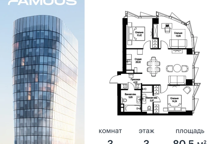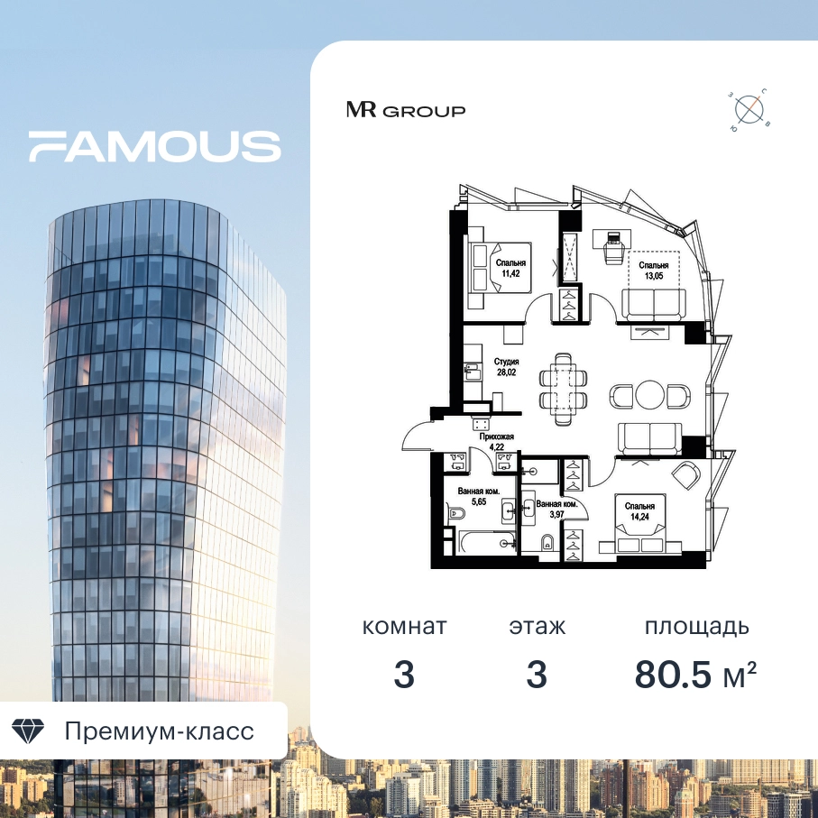 Прямая продажа от застройщика. Продаётся 3-к квартира общей площадью 80.57 кв. м с предчистовой отделкой на 3-м этаже премиального небоскреба Famous. Срок ввода в эксплуатацию - IV кв. 2024 г. Выдача ключей - II кв. 2025 г. Если к слову «будущее» подобрать архитектурный синоним, им непременно станет премиальный небоскреб Famous. Он расположен в закрытом квартале «Фили Сити» – настоящем городе в городе, окруженном зеленым ореолом из аллей и скверов, с инфраструктурой для жизни и отдыха самых взыскательных горожан. Резидентов Famous ждет особая привилегия – открывающиеся из окон бескрайние панорамы, с видами на парк Фили, Поклонную гору, Москва-реку и Москва-Сити. Эффектный ультрасовременный 57-этажный небоскреб, пластичный в нижней части, наверху трансформируется и взмывает ввысь выразительной скульптурой с обтекаемой поверхностью. Фасад украшенный стеклянными эркерами в виде прямых треугольных призм, словно олицетворяет собой идеально собранный пазл. Это безупречное решение для тех, кто не боится лидерства и высоты, не ищет простых путей, держит высокую планку во всем, не останавливается на достигнутом и живет в ритме мегаполиса. Не зря логотип Famous украшает графический элемент Триумфальной арки на Кутузовском проспекте – символ успеха и жизненных побед. Особенности дома: • Проект премиум-класса рядом с центром Москвы • Футуристическая авторская архитектура от бюро ADM • Ультрасовременные инженерные решения современных небоскрёбов • Элегантное решение орнаментальной композиции фасада от бюро ADM • Famous станет первым проектом в Москве с интерьерами лобби от международной архитектурной компании A ++ • Панорамное остекление по всему фасаду, головокружительные виды на достопримечательности Москвы, парк Фили, Москва-Сити и Поклонную гору • Европейский подход к благоустройству: площадь с фонтанами, парк-променад, детские и спортивные площадки, зоны отдыха • Продуманная концепция инфраструктуры: уютные кафе и рестораны, супермаркет, фитнес-студия, службы сервиса, детский центр развития • Эргономичные планировки от бюро Олега Клодта Транспортная доступность: • Удобный выезд на Кутузовский проспект и ТТК • В пешей доступности станции метро «Фили», «Багратионовская» и «Парк Победы» Компания MR Group предлагает своим клиентам специальные условия приобретения квартир в рамках программ ипотечного кредитования от банков-партнеров.О застройщике
