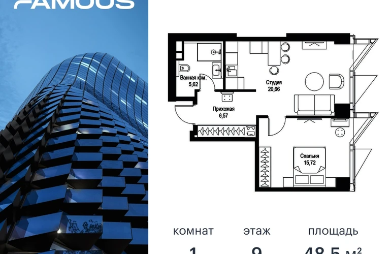 Прямая продажа от застройщика. Продаётся 1-к квартира общей площадью 48.57 кв. м с предчистовой отделкой на 9-м этаже премиального небоскреба Famous. Срок ввода в эксплуатацию - IV кв. 2024 г. Выдача ключей - II кв. 2025 г. Если к слову «будущее» подобрать архитектурный синоним, им непременно станет премиальный небоскреб Famous. Он расположен в закрытом квартале «Фили Сити» – настоящем городе в городе, окруженном зеленым ореолом из аллей и скверов, с инфраструктурой для жизни и отдыха самых взыскательных горожан. Резидентов Famous ждет особая привилегия – открывающиеся из окон бескрайние панорамы, с видами на парк Фили, Поклонную гору, Москва-реку и Москва-Сити. Эффектный ультрасовременный 57-этажный небоскреб, пластичный в нижней части, наверху трансформируется и взмывает ввысь выразительной скульптурой с обтекаемой поверхностью. Фасад украшенный стеклянными эркерами в виде прямых треугольных призм, словно олицетворяет собой идеально собранный пазл. Это безупречное решение для тех, кто не боится лидерства и высоты, не ищет простых путей, держит высокую планку во всем, не останавливается на достигнутом и живет в ритме мегаполиса. Не зря логотип Famous украшает графический элемент Триумфальной арки на Кутузовском проспекте – символ успеха и жизненных побед. Особенности дома: • Проект премиум-класса рядом с центром Москвы • Футуристическая авторская архитектура от бюро ADM • Ультрасовременные инженерные решения современных небоскрёбов • Элегантное решение орнаментальной композиции фасада от бюро ADM • Famous станет первым проектом в Москве с интерьерами лобби от международной архитектурной компании A ++ • Панорамное остекление по всему фасаду, головокружительные виды на достопримечательности Москвы, парк Фили, Москва-Сити и Поклонную гору • Европейский подход к благоустройству: площадь с фонтанами, парк-променад, детские и спортивные площадки, зоны отдыха • Продуманная концепция инфраструктуры: уютные кафе и рестораны, супермаркет, фитнес-студия, службы сервиса, детский центр развития • Эргономичные планировки от бюро Олега Клодта Транспортная доступность: • Удобный выезд на Кутузовский проспект и ТТК • В пешей доступности станции метро «Фили», «Багратионовская» и «Парк Победы» Компания MR Group предлагает своим клиентам специальные условия приобретения квартир в рамках программ ипотечного кредитования от банков-партнеров.О застройщике