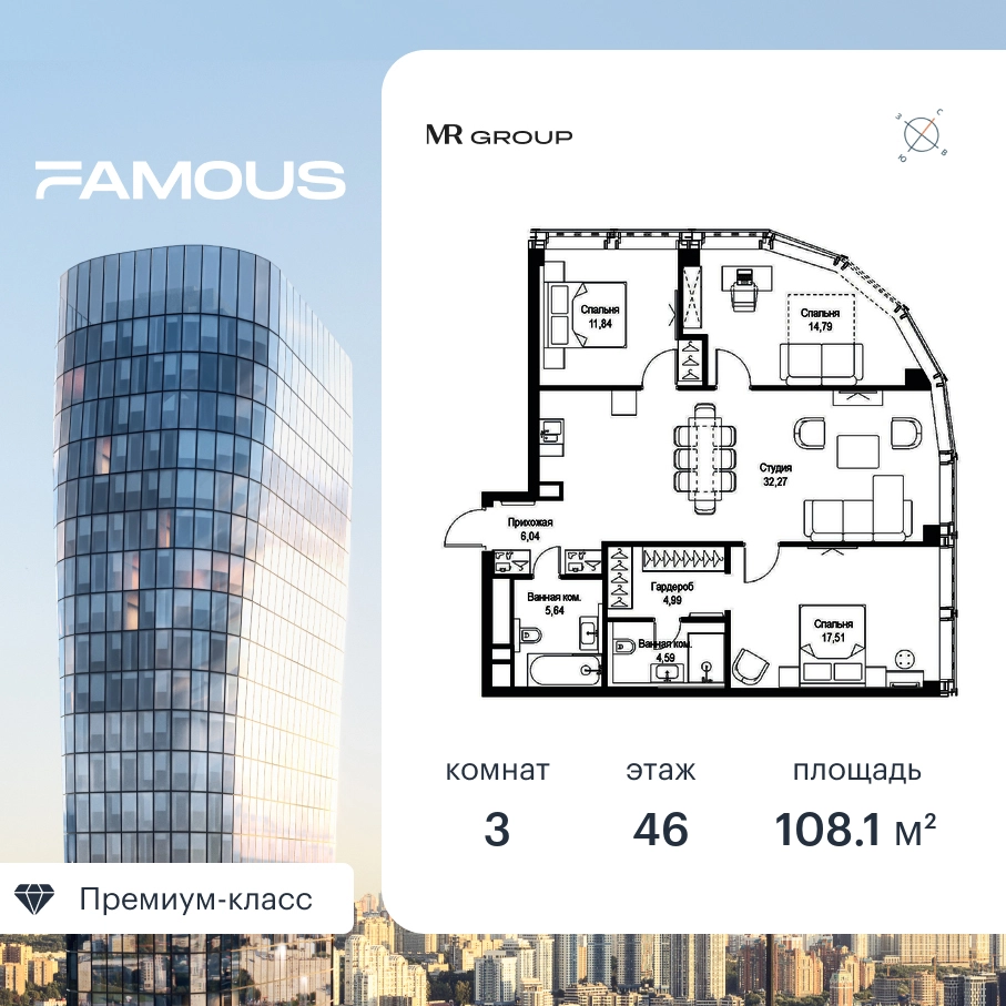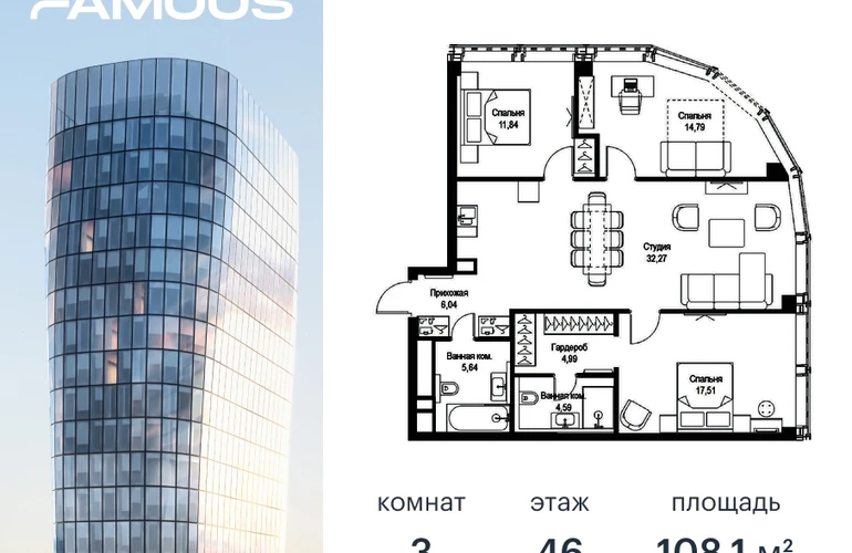 Прямая продажа от застройщика. Продаётся 3-к квартира общей площадью 108.17 кв. м с предчистовой отделкой на 46-м этаже премиального небоскреба Famous. Срок ввода в эксплуатацию - IV кв. 2024 г. Выдача ключей - II кв. 2025 г. Если к слову «будущее» подобрать архитектурный синоним, им непременно станет премиальный небоскреб Famous. Он расположен в закрытом квартале «Фили Сити» – настоящем городе в городе, окруженном зеленым ореолом из аллей и скверов, с инфраструктурой для жизни и отдыха самых взыскательных горожан. Резидентов Famous ждет особая привилегия – открывающиеся из окон бескрайние панорамы, с видами на парк Фили, Поклонную гору, Москва-реку и Москва-Сити. Эффектный ультрасовременный 57-этажный небоскреб, пластичный в нижней части, наверху трансформируется и взмывает ввысь выразительной скульптурой с обтекаемой поверхностью. Фасад украшенный стеклянными эркерами в виде прямых треугольных призм, словно олицетворяет собой идеально собранный пазл. Это безупречное решение для тех, кто не боится лидерства и высоты, не ищет простых путей, держит высокую планку во всем, не останавливается на достигнутом и живет в ритме мегаполиса. Не зря логотип Famous украшает графический элемент Триумфальной арки на Кутузовском проспекте – символ успеха и жизненных побед. Особенности дома: • Проект премиум-класса рядом с центром Москвы • Футуристическая авторская архитектура от бюро ADM • Ультрасовременные инженерные решения современных небоскрёбов • Элегантное решение орнаментальной композиции фасада от бюро ADM • Famous станет первым проектом в Москве с интерьерами лобби от международной архитектурной компании A ++ • Панорамное остекление по всему фасаду, головокружительные виды на достопримечательности Москвы, парк Фили, Москва-Сити и Поклонную гору • Европейский подход к благоустройству: площадь с фонтанами, парк-променад, детские и спортивные площадки, зоны отдыха • Продуманная концепция инфраструктуры: уютные кафе и рестораны, супермаркет, фитнес-студия, службы сервиса, детский центр развития • Эргономичные планировки от бюро Олега Клодта Транспортная доступность: • Удобный выезд на Кутузовский проспект и ТТК • В пешей доступности станции метро «Фили», «Багратионовская» и «Парк Победы» Компания MR Group предлагает своим клиентам специальные условия приобретения квартир в рамках программ ипотечного кредитования от банков-партнеров.О застройщике