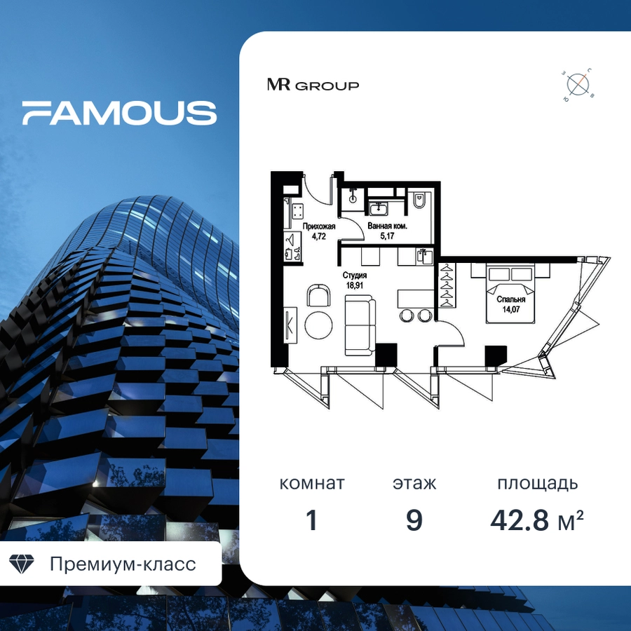 Прямая продажа от застройщика. Продаётся 1-к квартира общей площадью 42.87 кв. м с предчистовой отделкой на 9-м этаже премиального небоскреба Famous. Срок ввода в эксплуатацию - IV кв. 2024 г. Выдача ключей - II кв. 2025 г. Если к слову «будущее» подобрать архитектурный синоним, им непременно станет премиальный небоскреб Famous. Он расположен в закрытом квартале «Фили Сити» – настоящем городе в городе, окруженном зеленым ореолом из аллей и скверов, с инфраструктурой для жизни и отдыха самых взыскательных горожан. Резидентов Famous ждет особая привилегия – открывающиеся из окон бескрайние панорамы, с видами на парк Фили, Поклонную гору, Москва-реку и Москва-Сити. Эффектный ультрасовременный 57-этажный небоскреб, пластичный в нижней части, наверху трансформируется и взмывает ввысь выразительной скульптурой с обтекаемой поверхностью. Фасад украшенный стеклянными эркерами в виде прямых треугольных призм, словно олицетворяет собой идеально собранный пазл. Это безупречное решение для тех, кто не боится лидерства и высоты, не ищет простых путей, держит высокую планку во всем, не останавливается на достигнутом и живет в ритме мегаполиса. Не зря логотип Famous украшает графический элемент Триумфальной арки на Кутузовском проспекте – символ успеха и жизненных побед. Особенности дома: • Проект премиум-класса рядом с центром Москвы • Футуристическая авторская архитектура от бюро ADM • Ультрасовременные инженерные решения современных небоскрёбов • Элегантное решение орнаментальной композиции фасада от бюро ADM • Famous станет первым проектом в Москве с интерьерами лобби от международной архитектурной компании A ++ • Панорамное остекление по всему фасаду, головокружительные виды на достопримечательности Москвы, парк Фили, Москва-Сити и Поклонную гору • Европейский подход к благоустройству: площадь с фонтанами, парк-променад, детские и спортивные площадки, зоны отдыха • Продуманная концепция инфраструктуры: уютные кафе и рестораны, супермаркет, фитнес-студия, службы сервиса, детский центр развития • Эргономичные планировки от бюро Олега Клодта Транспортная доступность: • Удобный выезд на Кутузовский проспект и ТТК • В пешей доступности станции метро «Фили», «Багратионовская» и «Парк Победы» Компания MR Group предлагает своим клиентам специальные условия приобретения квартир в рамках программ ипотечного кредитования от банков-партнеров.О застройщике