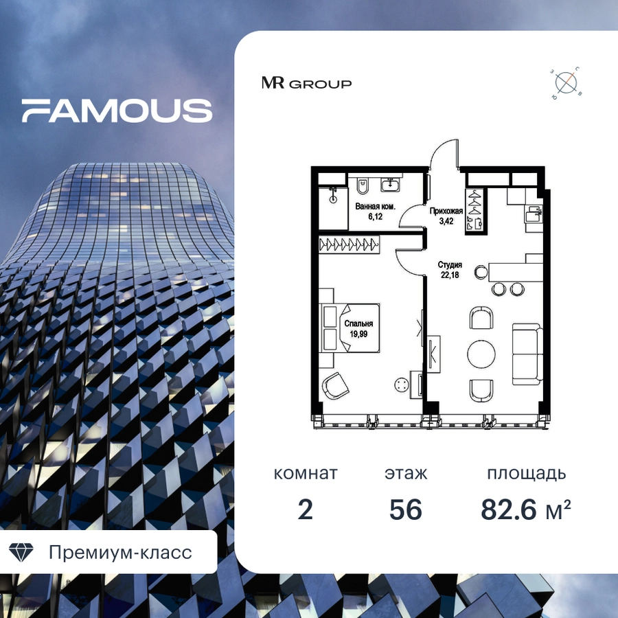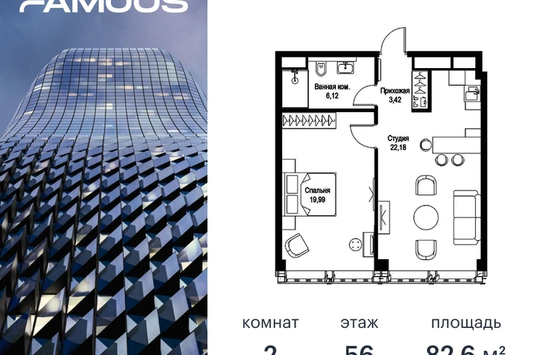 Прямая продажа от застройщика. Продаётся 2-к квартира общей площадью 82.67 кв. м с предчистовой отделкой на 56-м этаже премиального небоскреба Famous. Срок ввода в эксплуатацию - IV кв. 2024 г. Выдача ключей - II кв. 2025 г. Если к слову «будущее» подобрать архитектурный синоним, им непременно станет премиальный небоскреб Famous. Он расположен в закрытом квартале «Фили Сити» – настоящем городе в городе, окруженном зеленым ореолом из аллей и скверов, с инфраструктурой для жизни и отдыха самых взыскательных горожан. Резидентов Famous ждет особая привилегия – открывающиеся из окон бескрайние панорамы, с видами на парк Фили, Поклонную гору, Москва-реку и Москва-Сити. Эффектный ультрасовременный 57-этажный небоскреб, пластичный в нижней части, наверху трансформируется и взмывает ввысь выразительной скульптурой с обтекаемой поверхностью. Фасад украшенный стеклянными эркерами в виде прямых треугольных призм, словно олицетворяет собой идеально собранный пазл. Это безупречное решение для тех, кто не боится лидерства и высоты, не ищет простых путей, держит высокую планку во всем, не останавливается на достигнутом и живет в ритме мегаполиса. Не зря логотип Famous украшает графический элемент Триумфальной арки на Кутузовском проспекте – символ успеха и жизненных побед. Особенности дома: • Проект премиум-класса рядом с центром Москвы • Футуристическая авторская архитектура от бюро ADM • Ультрасовременные инженерные решения современных небоскрёбов • Элегантное решение орнаментальной композиции фасада от бюро ADM • Famous станет первым проектом в Москве с интерьерами лобби от международной архитектурной компании A ++ • Панорамное остекление по всему фасаду, головокружительные виды на достопримечательности Москвы, парк Фили, Москва-Сити и Поклонную гору • Европейский подход к благоустройству: площадь с фонтанами, парк-променад, детские и спортивные площадки, зоны отдыха • Продуманная концепция инфраструктуры: уютные кафе и рестораны, супермаркет, фитнес-студия, службы сервиса, детский центр развития • Эргономичные планировки от бюро Олега Клодта Транспортная доступность: • Удобный выезд на Кутузовский проспект и ТТК • В пешей доступности станции метро «Фили», «Багратионовская» и «Парк Победы» Компания MR Group предлагает своим клиентам специальные условия приобретения квартир в рамках программ ипотечного кредитования от банков-партнеров.О застройщике