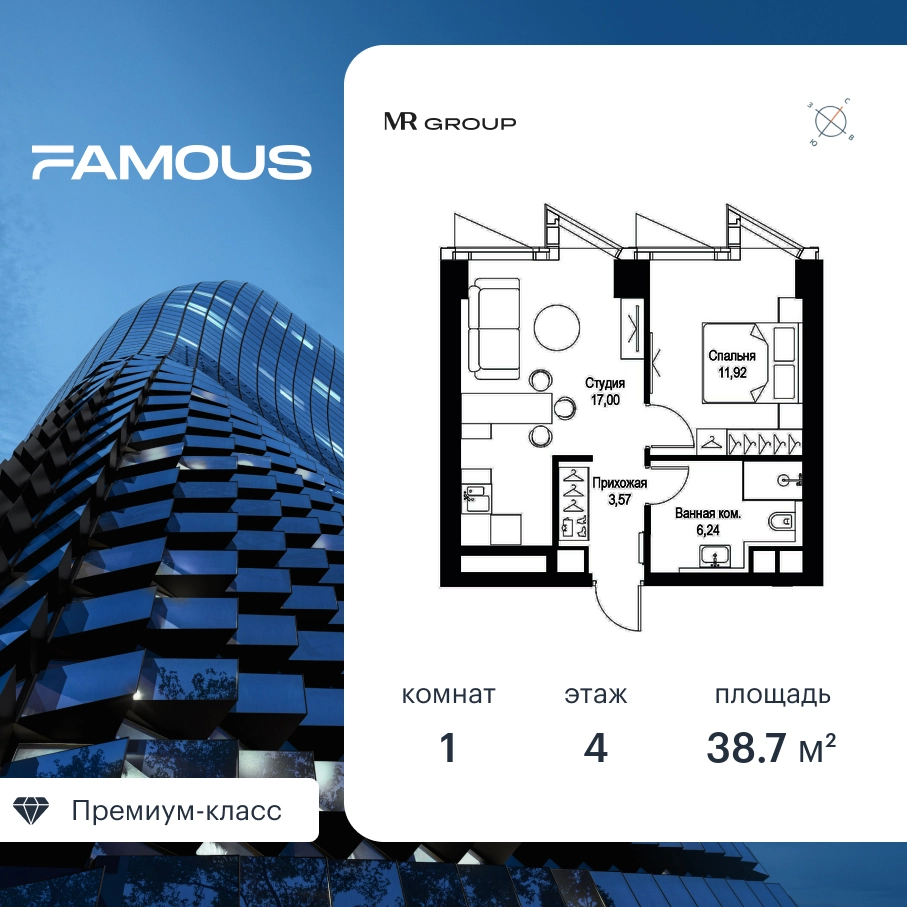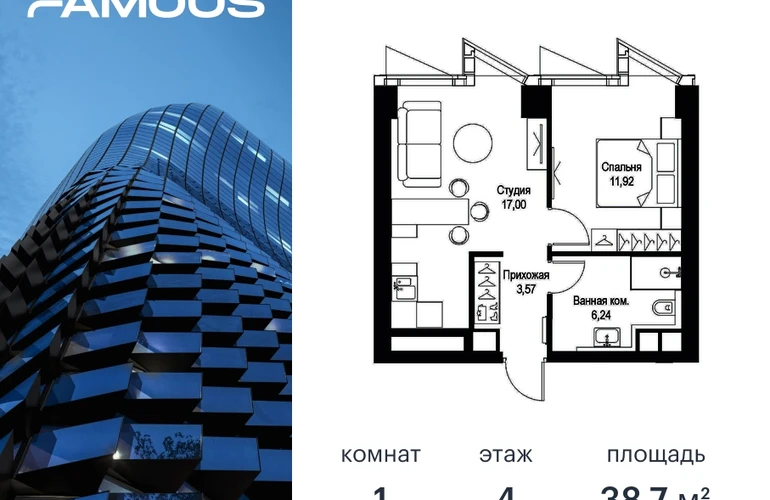 Прямая продажа от застройщика. Продаётся 1-к квартира общей площадью 38.73 кв. м с предчистовой отделкой на 4-м этаже премиального небоскреба Famous. Срок ввода в эксплуатацию - IV кв. 2024 г. Выдача ключей - II кв. 2025 г. Если к слову «будущее» подобрать архитектурный синоним, им непременно станет премиальный небоскреб Famous. Он расположен в закрытом квартале «Фили Сити» – настоящем городе в городе, окруженном зеленым ореолом из аллей и скверов, с инфраструктурой для жизни и отдыха самых взыскательных горожан. Резидентов Famous ждет особая привилегия – открывающиеся из окон бескрайние панорамы, с видами на парк Фили, Поклонную гору, Москва-реку и Москва-Сити. Эффектный ультрасовременный 57-этажный небоскреб, пластичный в нижней части, наверху трансформируется и взмывает ввысь выразительной скульптурой с обтекаемой поверхностью. Фасад украшенный стеклянными эркерами в виде прямых треугольных призм, словно олицетворяет собой идеально собранный пазл. Это безупречное решение для тех, кто не боится лидерства и высоты, не ищет простых путей, держит высокую планку во всем, не останавливается на достигнутом и живет в ритме мегаполиса. Не зря логотип Famous украшает графический элемент Триумфальной арки на Кутузовском проспекте – символ успеха и жизненных побед. Особенности дома: • Проект премиум-класса рядом с центром Москвы • Футуристическая авторская архитектура от бюро ADM • Ультрасовременные инженерные решения современных небоскрёбов • Элегантное решение орнаментальной композиции фасада от бюро ADM • Famous станет первым проектом в Москве с интерьерами лобби от международной архитектурной компании A ++ • Панорамное остекление по всему фасаду, головокружительные виды на достопримечательности Москвы, парк Фили, Москва-Сити и Поклонную гору • Европейский подход к благоустройству: площадь с фонтанами, парк-променад, детские и спортивные площадки, зоны отдыха • Продуманная концепция инфраструктуры: уютные кафе и рестораны, супермаркет, фитнес-студия, службы сервиса, детский центр развития • Эргономичные планировки от бюро Олега Клодта Транспортная доступность: • Удобный выезд на Кутузовский проспект и ТТК • В пешей доступности станции метро «Фили», «Багратионовская» и «Парк Победы» Компания MR Group предлагает своим клиентам специальные условия приобретения квартир в рамках программ ипотечного кредитования от банков-партнеров.О застройщике