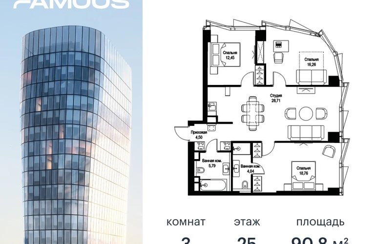 Прямая продажа от застройщика. Продаётся 3-к квартира общей площадью 90.87 кв. м с предчистовой отделкой на 25-м этаже премиального небоскреба Famous. Срок ввода в эксплуатацию - IV кв. 2024 г. Выдача ключей - II кв. 2025 г. Если к слову «будущее» подобрать архитектурный синоним, им непременно станет премиальный небоскреб Famous. Он расположен в закрытом квартале «Фили Сити» – настоящем городе в городе, окруженном зеленым ореолом из аллей и скверов, с инфраструктурой для жизни и отдыха самых взыскательных горожан. Резидентов Famous ждет особая привилегия – открывающиеся из окон бескрайние панорамы, с видами на парк Фили, Поклонную гору, Москва-реку и Москва-Сити. Эффектный ультрасовременный 57-этажный небоскреб, пластичный в нижней части, наверху трансформируется и взмывает ввысь выразительной скульптурой с обтекаемой поверхностью. Фасад украшенный стеклянными эркерами в виде прямых треугольных призм, словно олицетворяет собой идеально собранный пазл. Это безупречное решение для тех, кто не боится лидерства и высоты, не ищет простых путей, держит высокую планку во всем, не останавливается на достигнутом и живет в ритме мегаполиса. Не зря логотип Famous украшает графический элемент Триумфальной арки на Кутузовском проспекте – символ успеха и жизненных побед. Особенности дома: • Проект премиум-класса рядом с центром Москвы • Футуристическая авторская архитектура от бюро ADM • Ультрасовременные инженерные решения современных небоскрёбов • Элегантное решение орнаментальной композиции фасада от бюро ADM • Famous станет первым проектом в Москве с интерьерами лобби от международной архитектурной компании A ++ • Панорамное остекление по всему фасаду, головокружительные виды на достопримечательности Москвы, парк Фили, Москва-Сити и Поклонную гору • Европейский подход к благоустройству: площадь с фонтанами, парк-променад, детские и спортивные площадки, зоны отдыха • Продуманная концепция инфраструктуры: уютные кафе и рестораны, супермаркет, фитнес-студия, службы сервиса, детский центр развития • Эргономичные планировки от бюро Олега Клодта Транспортная доступность: • Удобный выезд на Кутузовский проспект и ТТК • В пешей доступности станции метро «Фили», «Багратионовская» и «Парк Победы» Компания MR Group предлагает своим клиентам специальные условия приобретения квартир в рамках программ ипотечного кредитования от банков-партнеров.О застройщике