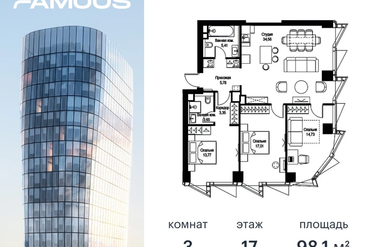 Прямая продажа от застройщика. Продаётся 3-к квартира общей площадью 98.17 кв. м с предчистовой отделкой на 17-м этаже премиального небоскреба Famous. Срок ввода в эксплуатацию - IV кв. 2024 г. Выдача ключей - II кв. 2025 г. Если к слову «будущее» подобрать архитектурный синоним, им непременно станет премиальный небоскреб Famous. Он расположен в закрытом квартале «Фили Сити» – настоящем городе в городе, окруженном зеленым ореолом из аллей и скверов, с инфраструктурой для жизни и отдыха самых взыскательных горожан. Резидентов Famous ждет особая привилегия – открывающиеся из окон бескрайние панорамы, с видами на парк Фили, Поклонную гору, Москва-реку и Москва-Сити. Эффектный ультрасовременный 57-этажный небоскреб, пластичный в нижней части, наверху трансформируется и взмывает ввысь выразительной скульптурой с обтекаемой поверхностью. Фасад украшенный стеклянными эркерами в виде прямых треугольных призм, словно олицетворяет собой идеально собранный пазл. Это безупречное решение для тех, кто не боится лидерства и высоты, не ищет простых путей, держит высокую планку во всем, не останавливается на достигнутом и живет в ритме мегаполиса. Не зря логотип Famous украшает графический элемент Триумфальной арки на Кутузовском проспекте – символ успеха и жизненных побед. Особенности дома: • Проект премиум-класса рядом с центром Москвы • Футуристическая авторская архитектура от бюро ADM • Ультрасовременные инженерные решения современных небоскрёбов • Элегантное решение орнаментальной композиции фасада от бюро ADM • Famous станет первым проектом в Москве с интерьерами лобби от международной архитектурной компании A ++ • Панорамное остекление по всему фасаду, головокружительные виды на достопримечательности Москвы, парк Фили, Москва-Сити и Поклонную гору • Европейский подход к благоустройству: площадь с фонтанами, парк-променад, детские и спортивные площадки, зоны отдыха • Продуманная концепция инфраструктуры: уютные кафе и рестораны, супермаркет, фитнес-студия, службы сервиса, детский центр развития • Эргономичные планировки от бюро Олега Клодта Транспортная доступность: • Удобный выезд на Кутузовский проспект и ТТК • В пешей доступности станции метро «Фили», «Багратионовская» и «Парк Победы» Компания MR Group предлагает своим клиентам специальные условия приобретения квартир в рамках программ ипотечного кредитования от банков-партнеров.О застройщике