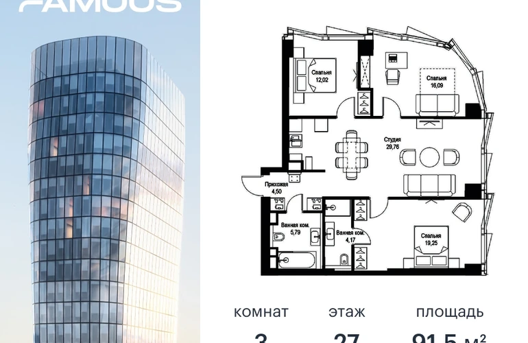 Прямая продажа от застройщика. Продаётся 3-к квартира общей площадью 91.54 кв. м с предчистовой отделкой на 27-м этаже премиального небоскреба Famous. Срок ввода в эксплуатацию - IV кв. 2024 г. Выдача ключей - II кв. 2025 г. Если к слову «будущее» подобрать архитектурный синоним, им непременно станет премиальный небоскреб Famous. Он расположен в закрытом квартале «Фили Сити» – настоящем городе в городе, окруженном зеленым ореолом из аллей и скверов, с инфраструктурой для жизни и отдыха самых взыскательных горожан. Резидентов Famous ждет особая привилегия – открывающиеся из окон бескрайние панорамы, с видами на парк Фили, Поклонную гору, Москва-реку и Москва-Сити. Эффектный ультрасовременный 57-этажный небоскреб, пластичный в нижней части, наверху трансформируется и взмывает ввысь выразительной скульптурой с обтекаемой поверхностью. Фасад украшенный стеклянными эркерами в виде прямых треугольных призм, словно олицетворяет собой идеально собранный пазл. Это безупречное решение для тех, кто не боится лидерства и высоты, не ищет простых путей, держит высокую планку во всем, не останавливается на достигнутом и живет в ритме мегаполиса. Не зря логотип Famous украшает графический элемент Триумфальной арки на Кутузовском проспекте – символ успеха и жизненных побед. Особенности дома: • Проект премиум-класса рядом с центром Москвы • Футуристическая авторская архитектура от бюро ADM • Ультрасовременные инженерные решения современных небоскрёбов • Элегантное решение орнаментальной композиции фасада от бюро ADM • Famous станет первым проектом в Москве с интерьерами лобби от международной архитектурной компании A ++ • Панорамное остекление по всему фасаду, головокружительные виды на достопримечательности Москвы, парк Фили, Москва-Сити и Поклонную гору • Европейский подход к благоустройству: площадь с фонтанами, парк-променад, детские и спортивные площадки, зоны отдыха • Продуманная концепция инфраструктуры: уютные кафе и рестораны, супермаркет, фитнес-студия, службы сервиса, детский центр развития • Эргономичные планировки от бюро Олега Клодта Транспортная доступность: • Удобный выезд на Кутузовский проспект и ТТК • В пешей доступности станции метро «Фили», «Багратионовская» и «Парк Победы» Компания MR Group предлагает своим клиентам специальные условия приобретения квартир в рамках программ ипотечного кредитования от банков-партнеров.О застройщике