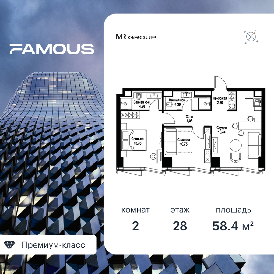 Прямая продажа от застройщика. Продаётся 2-к квартира общей площадью 58.48 кв. м с предчистовой отделкой на 28-м этаже премиального небоскреба Famous. Срок ввода в эксплуатацию - IV кв. 2024 г. Выдача ключей - II кв. 2025 г. Если к слову «будущее» подобрать архитектурный синоним, им непременно станет премиальный небоскреб Famous. Он расположен в закрытом квартале «Фили Сити» – настоящем городе в городе, окруженном зеленым ореолом из аллей и скверов, с инфраструктурой для жизни и отдыха самых взыскательных горожан. Резидентов Famous ждет особая привилегия – открывающиеся из окон бескрайние панорамы, с видами на парк Фили, Поклонную гору, Москва-реку и Москва-Сити. Эффектный ультрасовременный 57-этажный небоскреб, пластичный в нижней части, наверху трансформируется и взмывает ввысь выразительной скульптурой с обтекаемой поверхностью. Фасад украшенный стеклянными эркерами в виде прямых треугольных призм, словно олицетворяет собой идеально собранный пазл. Это безупречное решение для тех, кто не боится лидерства и высоты, не ищет простых путей, держит высокую планку во всем, не останавливается на достигнутом и живет в ритме мегаполиса. Не зря логотип Famous украшает графический элемент Триумфальной арки на Кутузовском проспекте – символ успеха и жизненных побед. Особенности дома: • Проект премиум-класса рядом с центром Москвы • Футуристическая авторская архитектура от бюро ADM • Ультрасовременные инженерные решения современных небоскрёбов • Элегантное решение орнаментальной композиции фасада от бюро ADM • Famous станет первым проектом в Москве с интерьерами лобби от международной архитектурной компании A ++ • Панорамное остекление по всему фасаду, головокружительные виды на достопримечательности Москвы, парк Фили, Москва-Сити и Поклонную гору • Европейский подход к благоустройству: площадь с фонтанами, парк-променад, детские и спортивные площадки, зоны отдыха • Продуманная концепция инфраструктуры: уютные кафе и рестораны, супермаркет, фитнес-студия, службы сервиса, детский центр развития • Эргономичные планировки от бюро Олега Клодта Транспортная доступность: • Удобный выезд на Кутузовский проспект и ТТК • В пешей доступности станции метро «Фили», «Багратионовская» и «Парк Победы» Компания MR Group предлагает своим клиентам специальные условия приобретения квартир в рамках программ ипотечного кредитования от банков-партнеров.О застройщике