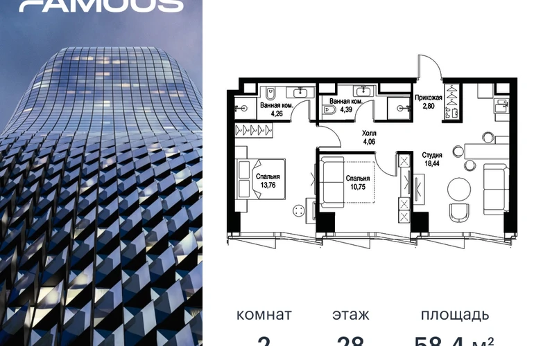 Прямая продажа от застройщика. Продаётся 2-к квартира общей площадью 58.48 кв. м с предчистовой отделкой на 28-м этаже премиального небоскреба Famous. Срок ввода в эксплуатацию - IV кв. 2024 г. Выдача ключей - II кв. 2025 г. Если к слову «будущее» подобрать архитектурный синоним, им непременно станет премиальный небоскреб Famous. Он расположен в закрытом квартале «Фили Сити» – настоящем городе в городе, окруженном зеленым ореолом из аллей и скверов, с инфраструктурой для жизни и отдыха самых взыскательных горожан. Резидентов Famous ждет особая привилегия – открывающиеся из окон бескрайние панорамы, с видами на парк Фили, Поклонную гору, Москва-реку и Москва-Сити. Эффектный ультрасовременный 57-этажный небоскреб, пластичный в нижней части, наверху трансформируется и взмывает ввысь выразительной скульптурой с обтекаемой поверхностью. Фасад украшенный стеклянными эркерами в виде прямых треугольных призм, словно олицетворяет собой идеально собранный пазл. Это безупречное решение для тех, кто не боится лидерства и высоты, не ищет простых путей, держит высокую планку во всем, не останавливается на достигнутом и живет в ритме мегаполиса. Не зря логотип Famous украшает графический элемент Триумфальной арки на Кутузовском проспекте – символ успеха и жизненных побед. Особенности дома: • Проект премиум-класса рядом с центром Москвы • Футуристическая авторская архитектура от бюро ADM • Ультрасовременные инженерные решения современных небоскрёбов • Элегантное решение орнаментальной композиции фасада от бюро ADM • Famous станет первым проектом в Москве с интерьерами лобби от международной архитектурной компании A ++ • Панорамное остекление по всему фасаду, головокружительные виды на достопримечательности Москвы, парк Фили, Москва-Сити и Поклонную гору • Европейский подход к благоустройству: площадь с фонтанами, парк-променад, детские и спортивные площадки, зоны отдыха • Продуманная концепция инфраструктуры: уютные кафе и рестораны, супермаркет, фитнес-студия, службы сервиса, детский центр развития • Эргономичные планировки от бюро Олега Клодта Транспортная доступность: • Удобный выезд на Кутузовский проспект и ТТК • В пешей доступности станции метро «Фили», «Багратионовская» и «Парк Победы» Компания MR Group предлагает своим клиентам специальные условия приобретения квартир в рамках программ ипотечного кредитования от банков-партнеров.О застройщике