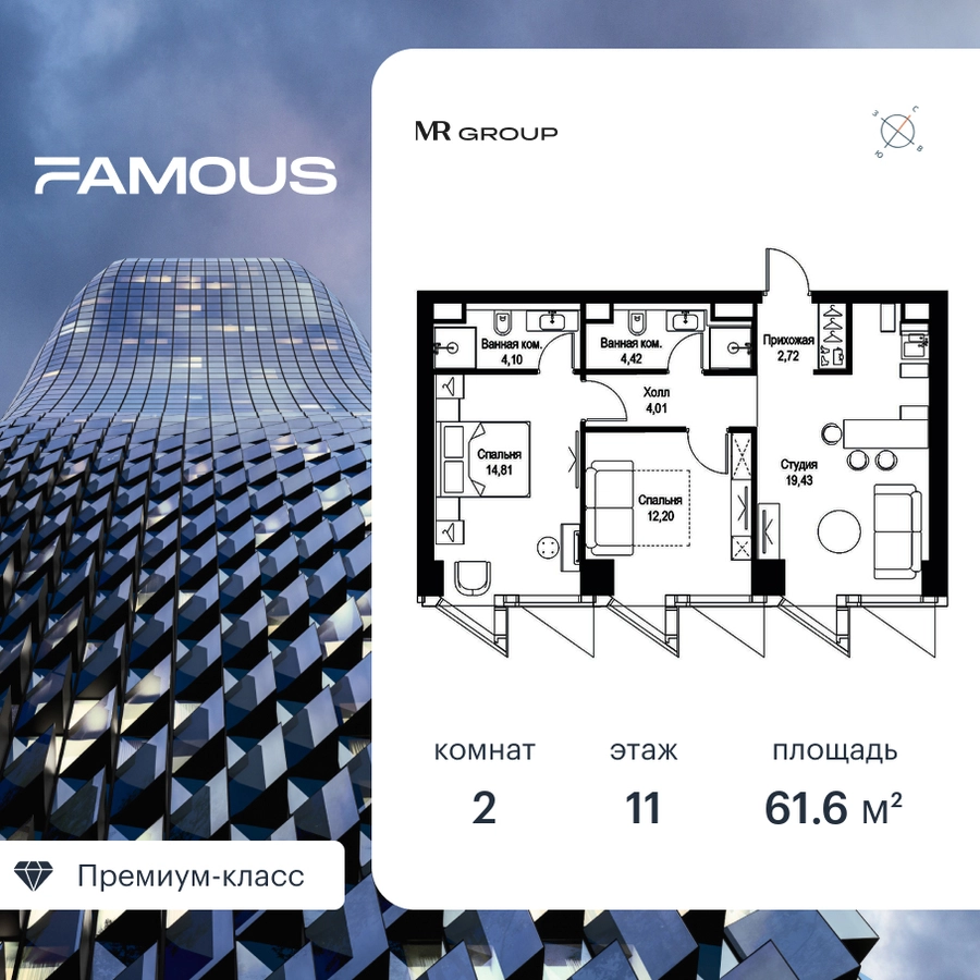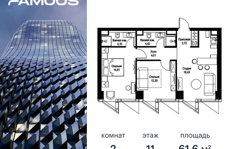 Прямая продажа от застройщика. Продаётся 2-к квартира общей площадью 61.69 кв. м с предчистовой отделкой на 11-м этаже премиального небоскреба Famous. Срок ввода в эксплуатацию - IV кв. 2024 г. Выдача ключей - II кв. 2025 г. Если к слову «будущее» подобрать архитектурный синоним, им непременно станет премиальный небоскреб Famous. Он расположен в закрытом квартале «Фили Сити» – настоящем городе в городе, окруженном зеленым ореолом из аллей и скверов, с инфраструктурой для жизни и отдыха самых взыскательных горожан. Резидентов Famous ждет особая привилегия – открывающиеся из окон бескрайние панорамы, с видами на парк Фили, Поклонную гору, Москва-реку и Москва-Сити. Эффектный ультрасовременный 57-этажный небоскреб, пластичный в нижней части, наверху трансформируется и взмывает ввысь выразительной скульптурой с обтекаемой поверхностью. Фасад украшенный стеклянными эркерами в виде прямых треугольных призм, словно олицетворяет собой идеально собранный пазл. Это безупречное решение для тех, кто не боится лидерства и высоты, не ищет простых путей, держит высокую планку во всем, не останавливается на достигнутом и живет в ритме мегаполиса. Не зря логотип Famous украшает графический элемент Триумфальной арки на Кутузовском проспекте – символ успеха и жизненных побед. Особенности дома: • Проект премиум-класса рядом с центром Москвы • Футуристическая авторская архитектура от бюро ADM • Ультрасовременные инженерные решения современных небоскрёбов • Элегантное решение орнаментальной композиции фасада от бюро ADM • Famous станет первым проектом в Москве с интерьерами лобби от международной архитектурной компании A ++ • Панорамное остекление по всему фасаду, головокружительные виды на достопримечательности Москвы, парк Фили, Москва-Сити и Поклонную гору • Европейский подход к благоустройству: площадь с фонтанами, парк-променад, детские и спортивные площадки, зоны отдыха • Продуманная концепция инфраструктуры: уютные кафе и рестораны, супермаркет, фитнес-студия, службы сервиса, детский центр развития • Эргономичные планировки от бюро Олега Клодта Транспортная доступность: • Удобный выезд на Кутузовский проспект и ТТК • В пешей доступности станции метро «Фили», «Багратионовская» и «Парк Победы» Компания MR Group предлагает своим клиентам специальные условия приобретения квартир в рамках программ ипотечного кредитования от банков-партнеров.О застройщике