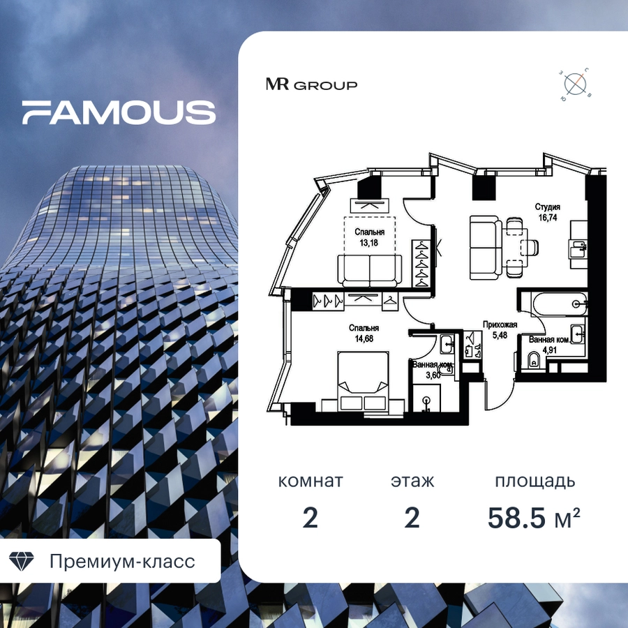 Прямая продажа от застройщика. Продаётся 2-к квартира общей площадью 58.58 кв. м с предчистовой отделкой на 2-м этаже премиального небоскреба Famous. Срок ввода в эксплуатацию - IV кв. 2024 г. Выдача ключей - II кв. 2025 г. Если к слову «будущее» подобрать архитектурный синоним, им непременно станет премиальный небоскреб Famous. Он расположен в закрытом квартале «Фили Сити» – настоящем городе в городе, окруженном зеленым ореолом из аллей и скверов, с инфраструктурой для жизни и отдыха самых взыскательных горожан. Резидентов Famous ждет особая привилегия – открывающиеся из окон бескрайние панорамы, с видами на парк Фили, Поклонную гору, Москва-реку и Москва-Сити. Эффектный ультрасовременный 57-этажный небоскреб, пластичный в нижней части, наверху трансформируется и взмывает ввысь выразительной скульптурой с обтекаемой поверхностью. Фасад украшенный стеклянными эркерами в виде прямых треугольных призм, словно олицетворяет собой идеально собранный пазл. Это безупречное решение для тех, кто не боится лидерства и высоты, не ищет простых путей, держит высокую планку во всем, не останавливается на достигнутом и живет в ритме мегаполиса. Не зря логотип Famous украшает графический элемент Триумфальной арки на Кутузовском проспекте – символ успеха и жизненных побед. Особенности дома: • Проект премиум-класса рядом с центром Москвы • Футуристическая авторская архитектура от бюро ADM • Ультрасовременные инженерные решения современных небоскрёбов • Элегантное решение орнаментальной композиции фасада от бюро ADM • Famous станет первым проектом в Москве с интерьерами лобби от международной архитектурной компании A ++ • Панорамное остекление по всему фасаду, головокружительные виды на достопримечательности Москвы, парк Фили, Москва-Сити и Поклонную гору • Европейский подход к благоустройству: площадь с фонтанами, парк-променад, детские и спортивные площадки, зоны отдыха • Продуманная концепция инфраструктуры: уютные кафе и рестораны, супермаркет, фитнес-студия, службы сервиса, детский центр развития • Эргономичные планировки от бюро Олега Клодта Транспортная доступность: • Удобный выезд на Кутузовский проспект и ТТК • В пешей доступности станции метро «Фили», «Багратионовская» и «Парк Победы» Компания MR Group предлагает своим клиентам специальные условия приобретения квартир в рамках программ ипотечного кредитования от банков-партнеров.О застройщике