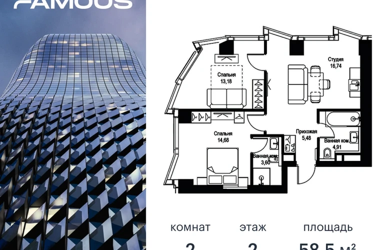 Прямая продажа от застройщика. Продаётся 2-к квартира общей площадью 58.58 кв. м с предчистовой отделкой на 2-м этаже премиального небоскреба Famous. Срок ввода в эксплуатацию - IV кв. 2024 г. Выдача ключей - II кв. 2025 г. Если к слову «будущее» подобрать архитектурный синоним, им непременно станет премиальный небоскреб Famous. Он расположен в закрытом квартале «Фили Сити» – настоящем городе в городе, окруженном зеленым ореолом из аллей и скверов, с инфраструктурой для жизни и отдыха самых взыскательных горожан. Резидентов Famous ждет особая привилегия – открывающиеся из окон бескрайние панорамы, с видами на парк Фили, Поклонную гору, Москва-реку и Москва-Сити. Эффектный ультрасовременный 57-этажный небоскреб, пластичный в нижней части, наверху трансформируется и взмывает ввысь выразительной скульптурой с обтекаемой поверхностью. Фасад украшенный стеклянными эркерами в виде прямых треугольных призм, словно олицетворяет собой идеально собранный пазл. Это безупречное решение для тех, кто не боится лидерства и высоты, не ищет простых путей, держит высокую планку во всем, не останавливается на достигнутом и живет в ритме мегаполиса. Не зря логотип Famous украшает графический элемент Триумфальной арки на Кутузовском проспекте – символ успеха и жизненных побед. Особенности дома: • Проект премиум-класса рядом с центром Москвы • Футуристическая авторская архитектура от бюро ADM • Ультрасовременные инженерные решения современных небоскрёбов • Элегантное решение орнаментальной композиции фасада от бюро ADM • Famous станет первым проектом в Москве с интерьерами лобби от международной архитектурной компании A ++ • Панорамное остекление по всему фасаду, головокружительные виды на достопримечательности Москвы, парк Фили, Москва-Сити и Поклонную гору • Европейский подход к благоустройству: площадь с фонтанами, парк-променад, детские и спортивные площадки, зоны отдыха • Продуманная концепция инфраструктуры: уютные кафе и рестораны, супермаркет, фитнес-студия, службы сервиса, детский центр развития • Эргономичные планировки от бюро Олега Клодта Транспортная доступность: • Удобный выезд на Кутузовский проспект и ТТК • В пешей доступности станции метро «Фили», «Багратионовская» и «Парк Победы» Компания MR Group предлагает своим клиентам специальные условия приобретения квартир в рамках программ ипотечного кредитования от банков-партнеров.О застройщике