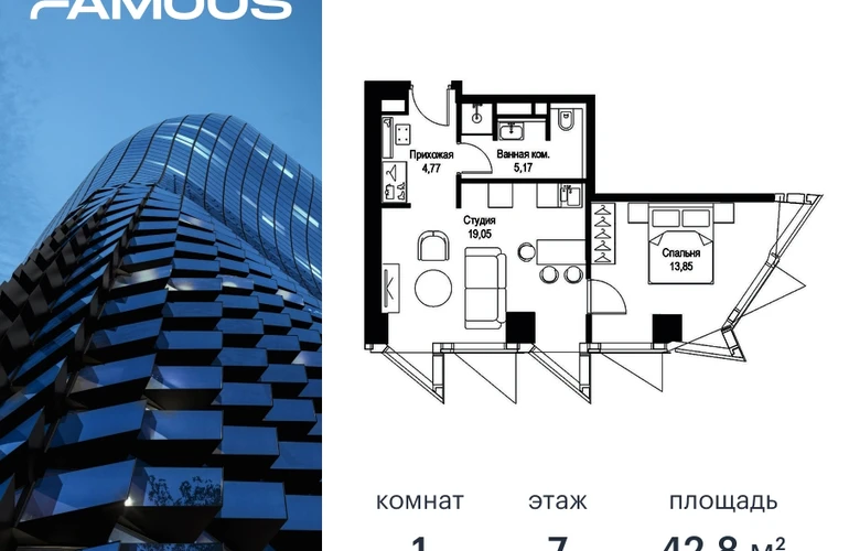 Прямая продажа от застройщика. Продаётся 1-к квартира общей площадью 42.84 кв. м с предчистовой отделкой на 7-м этаже премиального небоскреба Famous. Срок ввода в эксплуатацию - IV кв. 2024 г. Выдача ключей - II кв. 2025 г. Если к слову «будущее» подобрать архитектурный синоним, им непременно станет премиальный небоскреб Famous. Он расположен в закрытом квартале «Фили Сити» – настоящем городе в городе, окруженном зеленым ореолом из аллей и скверов, с инфраструктурой для жизни и отдыха самых взыскательных горожан. Резидентов Famous ждет особая привилегия – открывающиеся из окон бескрайние панорамы, с видами на парк Фили, Поклонную гору, Москва-реку и Москва-Сити. Эффектный ультрасовременный 57-этажный небоскреб, пластичный в нижней части, наверху трансформируется и взмывает ввысь выразительной скульптурой с обтекаемой поверхностью. Фасад украшенный стеклянными эркерами в виде прямых треугольных призм, словно олицетворяет собой идеально собранный пазл. Это безупречное решение для тех, кто не боится лидерства и высоты, не ищет простых путей, держит высокую планку во всем, не останавливается на достигнутом и живет в ритме мегаполиса. Не зря логотип Famous украшает графический элемент Триумфальной арки на Кутузовском проспекте – символ успеха и жизненных побед. Особенности дома: • Проект премиум-класса рядом с центром Москвы • Футуристическая авторская архитектура от бюро ADM • Ультрасовременные инженерные решения современных небоскрёбов • Элегантное решение орнаментальной композиции фасада от бюро ADM • Famous станет первым проектом в Москве с интерьерами лобби от международной архитектурной компании A ++ • Панорамное остекление по всему фасаду, головокружительные виды на достопримечательности Москвы, парк Фили, Москва-Сити и Поклонную гору • Европейский подход к благоустройству: площадь с фонтанами, парк-променад, детские и спортивные площадки, зоны отдыха • Продуманная концепция инфраструктуры: уютные кафе и рестораны, супермаркет, фитнес-студия, службы сервиса, детский центр развития • Эргономичные планировки от бюро Олега Клодта Транспортная доступность: • Удобный выезд на Кутузовский проспект и ТТК • В пешей доступности станции метро «Фили», «Багратионовская» и «Парк Победы» Компания MR Group предлагает своим клиентам специальные условия приобретения квартир в рамках программ ипотечного кредитования от банков-партнеров.О застройщике