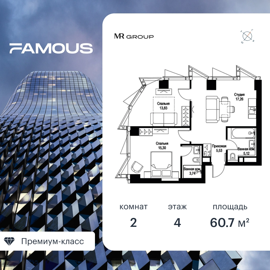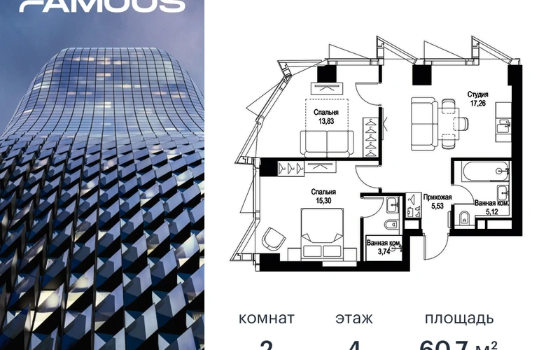 Прямая продажа от застройщика. Продаётся 2-к квартира общей площадью 60.78 кв. м с предчистовой отделкой на 4-м этаже премиального небоскреба Famous. Срок ввода в эксплуатацию - IV кв. 2024 г. Выдача ключей - II кв. 2025 г. Если к слову «будущее» подобрать архитектурный синоним, им непременно станет премиальный небоскреб Famous. Он расположен в закрытом квартале «Фили Сити» – настоящем городе в городе, окруженном зеленым ореолом из аллей и скверов, с инфраструктурой для жизни и отдыха самых взыскательных горожан. Резидентов Famous ждет особая привилегия – открывающиеся из окон бескрайние панорамы, с видами на парк Фили, Поклонную гору, Москва-реку и Москва-Сити. Эффектный ультрасовременный 57-этажный небоскреб, пластичный в нижней части, наверху трансформируется и взмывает ввысь выразительной скульптурой с обтекаемой поверхностью. Фасад украшенный стеклянными эркерами в виде прямых треугольных призм, словно олицетворяет собой идеально собранный пазл. Это безупречное решение для тех, кто не боится лидерства и высоты, не ищет простых путей, держит высокую планку во всем, не останавливается на достигнутом и живет в ритме мегаполиса. Не зря логотип Famous украшает графический элемент Триумфальной арки на Кутузовском проспекте – символ успеха и жизненных побед. Особенности дома: • Проект премиум-класса рядом с центром Москвы • Футуристическая авторская архитектура от бюро ADM • Ультрасовременные инженерные решения современных небоскрёбов • Элегантное решение орнаментальной композиции фасада от бюро ADM • Famous станет первым проектом в Москве с интерьерами лобби от международной архитектурной компании A ++ • Панорамное остекление по всему фасаду, головокружительные виды на достопримечательности Москвы, парк Фили, Москва-Сити и Поклонную гору • Европейский подход к благоустройству: площадь с фонтанами, парк-променад, детские и спортивные площадки, зоны отдыха • Продуманная концепция инфраструктуры: уютные кафе и рестораны, супермаркет, фитнес-студия, службы сервиса, детский центр развития • Эргономичные планировки от бюро Олега Клодта Транспортная доступность: • Удобный выезд на Кутузовский проспект и ТТК • В пешей доступности станции метро «Фили», «Багратионовская» и «Парк Победы» Компания MR Group предлагает своим клиентам специальные условия приобретения квартир в рамках программ ипотечного кредитования от банков-партнеров.О застройщике