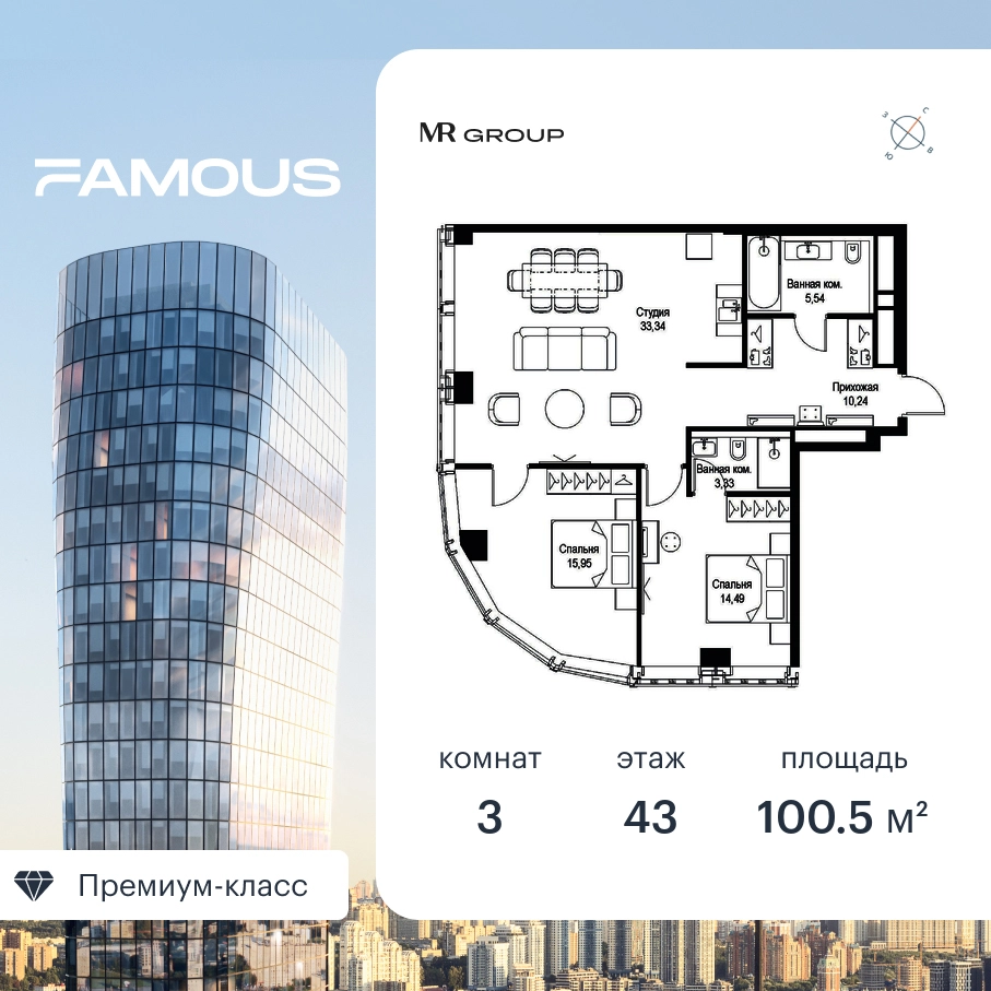 Прямая продажа от застройщика. Продаётся 3-к квартира общей площадью 100.53 кв. м с предчистовой отделкой на 43-м этаже премиального небоскреба Famous. Срок ввода в эксплуатацию - IV кв. 2024 г. Выдача ключей - II кв. 2025 г. Если к слову «будущее» подобрать архитектурный синоним, им непременно станет премиальный небоскреб Famous. Он расположен в закрытом квартале «Фили Сити» – настоящем городе в городе, окруженном зеленым ореолом из аллей и скверов, с инфраструктурой для жизни и отдыха самых взыскательных горожан. Резидентов Famous ждет особая привилегия – открывающиеся из окон бескрайние панорамы, с видами на парк Фили, Поклонную гору, Москва-реку и Москва-Сити. Эффектный ультрасовременный 57-этажный небоскреб, пластичный в нижней части, наверху трансформируется и взмывает ввысь выразительной скульптурой с обтекаемой поверхностью. Фасад украшенный стеклянными эркерами в виде прямых треугольных призм, словно олицетворяет собой идеально собранный пазл. Это безупречное решение для тех, кто не боится лидерства и высоты, не ищет простых путей, держит высокую планку во всем, не останавливается на достигнутом и живет в ритме мегаполиса. Не зря логотип Famous украшает графический элемент Триумфальной арки на Кутузовском проспекте – символ успеха и жизненных побед. Особенности дома: • Проект премиум-класса рядом с центром Москвы • Футуристическая авторская архитектура от бюро ADM • Ультрасовременные инженерные решения современных небоскрёбов • Элегантное решение орнаментальной композиции фасада от бюро ADM • Famous станет первым проектом в Москве с интерьерами лобби от международной архитектурной компании A ++ • Панорамное остекление по всему фасаду, головокружительные виды на достопримечательности Москвы, парк Фили, Москва-Сити и Поклонную гору • Европейский подход к благоустройству: площадь с фонтанами, парк-променад, детские и спортивные площадки, зоны отдыха • Продуманная концепция инфраструктуры: уютные кафе и рестораны, супермаркет, фитнес-студия, службы сервиса, детский центр развития • Эргономичные планировки от бюро Олега Клодта Транспортная доступность: • Удобный выезд на Кутузовский проспект и ТТК • В пешей доступности станции метро «Фили», «Багратионовская» и «Парк Победы» Компания MR Group предлагает своим клиентам специальные условия приобретения квартир в рамках программ ипотечного кредитования от банков-партнеров.О застройщике