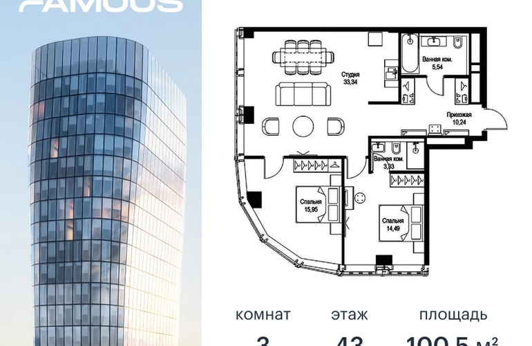 Прямая продажа от застройщика. Продаётся 3-к квартира общей площадью 100.53 кв. м с предчистовой отделкой на 43-м этаже премиального небоскреба Famous. Срок ввода в эксплуатацию - IV кв. 2024 г. Выдача ключей - II кв. 2025 г. Если к слову «будущее» подобрать архитектурный синоним, им непременно станет премиальный небоскреб Famous. Он расположен в закрытом квартале «Фили Сити» – настоящем городе в городе, окруженном зеленым ореолом из аллей и скверов, с инфраструктурой для жизни и отдыха самых взыскательных горожан. Резидентов Famous ждет особая привилегия – открывающиеся из окон бескрайние панорамы, с видами на парк Фили, Поклонную гору, Москва-реку и Москва-Сити. Эффектный ультрасовременный 57-этажный небоскреб, пластичный в нижней части, наверху трансформируется и взмывает ввысь выразительной скульптурой с обтекаемой поверхностью. Фасад украшенный стеклянными эркерами в виде прямых треугольных призм, словно олицетворяет собой идеально собранный пазл. Это безупречное решение для тех, кто не боится лидерства и высоты, не ищет простых путей, держит высокую планку во всем, не останавливается на достигнутом и живет в ритме мегаполиса. Не зря логотип Famous украшает графический элемент Триумфальной арки на Кутузовском проспекте – символ успеха и жизненных побед. Особенности дома: • Проект премиум-класса рядом с центром Москвы • Футуристическая авторская архитектура от бюро ADM • Ультрасовременные инженерные решения современных небоскрёбов • Элегантное решение орнаментальной композиции фасада от бюро ADM • Famous станет первым проектом в Москве с интерьерами лобби от международной архитектурной компании A ++ • Панорамное остекление по всему фасаду, головокружительные виды на достопримечательности Москвы, парк Фили, Москва-Сити и Поклонную гору • Европейский подход к благоустройству: площадь с фонтанами, парк-променад, детские и спортивные площадки, зоны отдыха • Продуманная концепция инфраструктуры: уютные кафе и рестораны, супермаркет, фитнес-студия, службы сервиса, детский центр развития • Эргономичные планировки от бюро Олега Клодта Транспортная доступность: • Удобный выезд на Кутузовский проспект и ТТК • В пешей доступности станции метро «Фили», «Багратионовская» и «Парк Победы» Компания MR Group предлагает своим клиентам специальные условия приобретения квартир в рамках программ ипотечного кредитования от банков-партнеров.О застройщике
