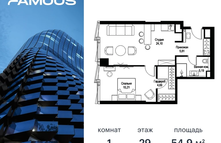 Прямая продажа от застройщика. Продаётся 1-к квартира общей площадью 54.98 кв. м с предчистовой отделкой на 29-м этаже премиального небоскреба Famous. Срок ввода в эксплуатацию - IV кв. 2024 г. Выдача ключей - II кв. 2025 г. Если к слову «будущее» подобрать архитектурный синоним, им непременно станет премиальный небоскреб Famous. Он расположен в закрытом квартале «Фили Сити» – настоящем городе в городе, окруженном зеленым ореолом из аллей и скверов, с инфраструктурой для жизни и отдыха самых взыскательных горожан. Резидентов Famous ждет особая привилегия – открывающиеся из окон бескрайние панорамы, с видами на парк Фили, Поклонную гору, Москва-реку и Москва-Сити. Эффектный ультрасовременный 57-этажный небоскреб, пластичный в нижней части, наверху трансформируется и взмывает ввысь выразительной скульптурой с обтекаемой поверхностью. Фасад украшенный стеклянными эркерами в виде прямых треугольных призм, словно олицетворяет собой идеально собранный пазл. Это безупречное решение для тех, кто не боится лидерства и высоты, не ищет простых путей, держит высокую планку во всем, не останавливается на достигнутом и живет в ритме мегаполиса. Не зря логотип Famous украшает графический элемент Триумфальной арки на Кутузовском проспекте – символ успеха и жизненных побед. Особенности дома: • Проект премиум-класса рядом с центром Москвы • Футуристическая авторская архитектура от бюро ADM • Ультрасовременные инженерные решения современных небоскрёбов • Элегантное решение орнаментальной композиции фасада от бюро ADM • Famous станет первым проектом в Москве с интерьерами лобби от международной архитектурной компании A ++ • Панорамное остекление по всему фасаду, головокружительные виды на достопримечательности Москвы, парк Фили, Москва-Сити и Поклонную гору • Европейский подход к благоустройству: площадь с фонтанами, парк-променад, детские и спортивные площадки, зоны отдыха • Продуманная концепция инфраструктуры: уютные кафе и рестораны, супермаркет, фитнес-студия, службы сервиса, детский центр развития • Эргономичные планировки от бюро Олега Клодта Транспортная доступность: • Удобный выезд на Кутузовский проспект и ТТК • В пешей доступности станции метро «Фили», «Багратионовская» и «Парк Победы» Компания MR Group предлагает своим клиентам специальные условия приобретения квартир в рамках программ ипотечного кредитования от банков-партнеров.О застройщике