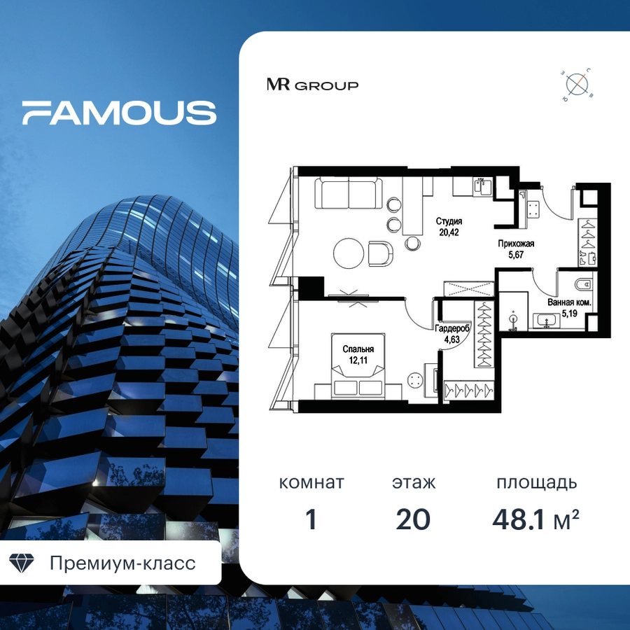Прямая продажа от застройщика. Продаётся 1-к квартира общей площадью 48.17 кв. м с предчистовой отделкой на 20-м этаже премиального небоскреба Famous. Срок ввода в эксплуатацию - IV кв. 2024 г. Выдача ключей - II кв. 2025 г. Если к слову «будущее» подобрать архитектурный синоним, им непременно станет премиальный небоскреб Famous. Он расположен в закрытом квартале «Фили Сити» – настоящем городе в городе, окруженном зеленым ореолом из аллей и скверов, с инфраструктурой для жизни и отдыха самых взыскательных горожан. Резидентов Famous ждет особая привилегия – открывающиеся из окон бескрайние панорамы, с видами на парк Фили, Поклонную гору, Москва-реку и Москва-Сити. Эффектный ультрасовременный 57-этажный небоскреб, пластичный в нижней части, наверху трансформируется и взмывает ввысь выразительной скульптурой с обтекаемой поверхностью. Фасад украшенный стеклянными эркерами в виде прямых треугольных призм, словно олицетворяет собой идеально собранный пазл. Это безупречное решение для тех, кто не боится лидерства и высоты, не ищет простых путей, держит высокую планку во всем, не останавливается на достигнутом и живет в ритме мегаполиса. Не зря логотип Famous украшает графический элемент Триумфальной арки на Кутузовском проспекте – символ успеха и жизненных побед. Особенности дома: • Проект премиум-класса рядом с центром Москвы • Футуристическая авторская архитектура от бюро ADM • Ультрасовременные инженерные решения современных небоскрёбов • Элегантное решение орнаментальной композиции фасада от бюро ADM • Famous станет первым проектом в Москве с интерьерами лобби от международной архитектурной компании A ++ • Панорамное остекление по всему фасаду, головокружительные виды на достопримечательности Москвы, парк Фили, Москва-Сити и Поклонную гору • Европейский подход к благоустройству: площадь с фонтанами, парк-променад, детские и спортивные площадки, зоны отдыха • Продуманная концепция инфраструктуры: уютные кафе и рестораны, супермаркет, фитнес-студия, службы сервиса, детский центр развития • Эргономичные планировки от бюро Олега Клодта Транспортная доступность: • Удобный выезд на Кутузовский проспект и ТТК • В пешей доступности станции метро «Фили», «Багратионовская» и «Парк Победы» Компания MR Group предлагает своим клиентам специальные условия приобретения квартир в рамках программ ипотечного кредитования от банков-партнеров.О застройщике