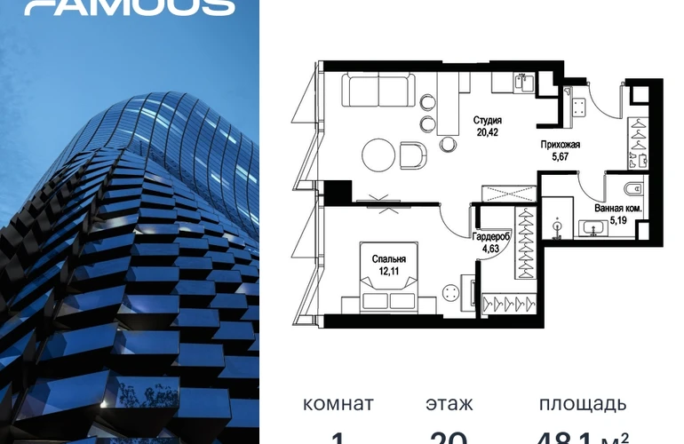 Прямая продажа от застройщика. Продаётся 1-к квартира общей площадью 48.17 кв. м с предчистовой отделкой на 20-м этаже премиального небоскреба Famous. Срок ввода в эксплуатацию - IV кв. 2024 г. Выдача ключей - II кв. 2025 г. Если к слову «будущее» подобрать архитектурный синоним, им непременно станет премиальный небоскреб Famous. Он расположен в закрытом квартале «Фили Сити» – настоящем городе в городе, окруженном зеленым ореолом из аллей и скверов, с инфраструктурой для жизни и отдыха самых взыскательных горожан. Резидентов Famous ждет особая привилегия – открывающиеся из окон бескрайние панорамы, с видами на парк Фили, Поклонную гору, Москва-реку и Москва-Сити. Эффектный ультрасовременный 57-этажный небоскреб, пластичный в нижней части, наверху трансформируется и взмывает ввысь выразительной скульптурой с обтекаемой поверхностью. Фасад украшенный стеклянными эркерами в виде прямых треугольных призм, словно олицетворяет собой идеально собранный пазл. Это безупречное решение для тех, кто не боится лидерства и высоты, не ищет простых путей, держит высокую планку во всем, не останавливается на достигнутом и живет в ритме мегаполиса. Не зря логотип Famous украшает графический элемент Триумфальной арки на Кутузовском проспекте – символ успеха и жизненных побед. Особенности дома: • Проект премиум-класса рядом с центром Москвы • Футуристическая авторская архитектура от бюро ADM • Ультрасовременные инженерные решения современных небоскрёбов • Элегантное решение орнаментальной композиции фасада от бюро ADM • Famous станет первым проектом в Москве с интерьерами лобби от международной архитектурной компании A ++ • Панорамное остекление по всему фасаду, головокружительные виды на достопримечательности Москвы, парк Фили, Москва-Сити и Поклонную гору • Европейский подход к благоустройству: площадь с фонтанами, парк-променад, детские и спортивные площадки, зоны отдыха • Продуманная концепция инфраструктуры: уютные кафе и рестораны, супермаркет, фитнес-студия, службы сервиса, детский центр развития • Эргономичные планировки от бюро Олега Клодта Транспортная доступность: • Удобный выезд на Кутузовский проспект и ТТК • В пешей доступности станции метро «Фили», «Багратионовская» и «Парк Победы» Компания MR Group предлагает своим клиентам специальные условия приобретения квартир в рамках программ ипотечного кредитования от банков-партнеров.О застройщике