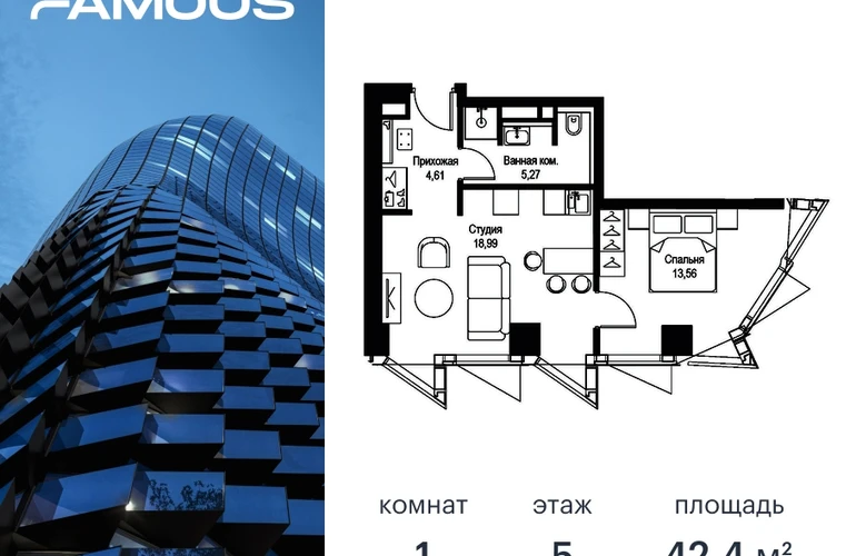 Прямая продажа от застройщика. Продаётся 1-к квартира общей площадью 42.48 кв. м с предчистовой отделкой на 5-м этаже премиального небоскреба Famous. Срок ввода в эксплуатацию - IV кв. 2024 г. Выдача ключей - II кв. 2025 г. Если к слову «будущее» подобрать архитектурный синоним, им непременно станет премиальный небоскреб Famous. Он расположен в закрытом квартале «Фили Сити» – настоящем городе в городе, окруженном зеленым ореолом из аллей и скверов, с инфраструктурой для жизни и отдыха самых взыскательных горожан. Резидентов Famous ждет особая привилегия – открывающиеся из окон бескрайние панорамы, с видами на парк Фили, Поклонную гору, Москва-реку и Москва-Сити. Эффектный ультрасовременный 57-этажный небоскреб, пластичный в нижней части, наверху трансформируется и взмывает ввысь выразительной скульптурой с обтекаемой поверхностью. Фасад украшенный стеклянными эркерами в виде прямых треугольных призм, словно олицетворяет собой идеально собранный пазл. Это безупречное решение для тех, кто не боится лидерства и высоты, не ищет простых путей, держит высокую планку во всем, не останавливается на достигнутом и живет в ритме мегаполиса. Не зря логотип Famous украшает графический элемент Триумфальной арки на Кутузовском проспекте – символ успеха и жизненных побед. Особенности дома: • Проект премиум-класса рядом с центром Москвы • Футуристическая авторская архитектура от бюро ADM • Ультрасовременные инженерные решения современных небоскрёбов • Элегантное решение орнаментальной композиции фасада от бюро ADM • Famous станет первым проектом в Москве с интерьерами лобби от международной архитектурной компании A ++ • Панорамное остекление по всему фасаду, головокружительные виды на достопримечательности Москвы, парк Фили, Москва-Сити и Поклонную гору • Европейский подход к благоустройству: площадь с фонтанами, парк-променад, детские и спортивные площадки, зоны отдыха • Продуманная концепция инфраструктуры: уютные кафе и рестораны, супермаркет, фитнес-студия, службы сервиса, детский центр развития • Эргономичные планировки от бюро Олега Клодта Транспортная доступность: • Удобный выезд на Кутузовский проспект и ТТК • В пешей доступности станции метро «Фили», «Багратионовская» и «Парк Победы» Компания MR Group предлагает своим клиентам специальные условия приобретения квартир в рамках программ ипотечного кредитования от банков-партнеров.О застройщике