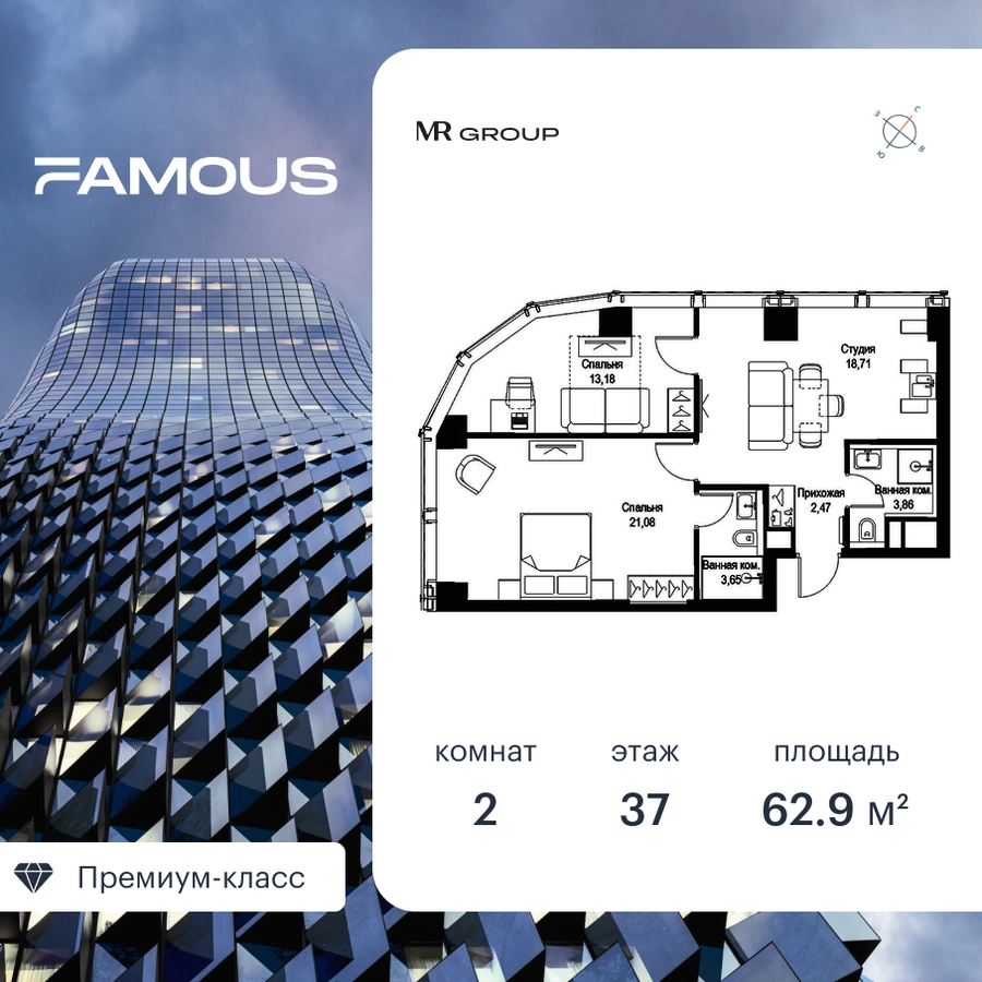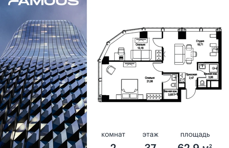 Прямая продажа от застройщика. Продаётся 2-к квартира общей площадью 62.95 кв. м с предчистовой отделкой на 37-м этаже премиального небоскреба Famous. Срок ввода в эксплуатацию - IV кв. 2024 г. Выдача ключей - II кв. 2025 г. Если к слову «будущее» подобрать архитектурный синоним, им непременно станет премиальный небоскреб Famous. Он расположен в закрытом квартале «Фили Сити» – настоящем городе в городе, окруженном зеленым ореолом из аллей и скверов, с инфраструктурой для жизни и отдыха самых взыскательных горожан. Резидентов Famous ждет особая привилегия – открывающиеся из окон бескрайние панорамы, с видами на парк Фили, Поклонную гору, Москва-реку и Москва-Сити. Эффектный ультрасовременный 57-этажный небоскреб, пластичный в нижней части, наверху трансформируется и взмывает ввысь выразительной скульптурой с обтекаемой поверхностью. Фасад украшенный стеклянными эркерами в виде прямых треугольных призм, словно олицетворяет собой идеально собранный пазл. Это безупречное решение для тех, кто не боится лидерства и высоты, не ищет простых путей, держит высокую планку во всем, не останавливается на достигнутом и живет в ритме мегаполиса. Не зря логотип Famous украшает графический элемент Триумфальной арки на Кутузовском проспекте – символ успеха и жизненных побед. Особенности дома: • Проект премиум-класса рядом с центром Москвы • Футуристическая авторская архитектура от бюро ADM • Ультрасовременные инженерные решения современных небоскрёбов • Элегантное решение орнаментальной композиции фасада от бюро ADM • Famous станет первым проектом в Москве с интерьерами лобби от международной архитектурной компании A ++ • Панорамное остекление по всему фасаду, головокружительные виды на достопримечательности Москвы, парк Фили, Москва-Сити и Поклонную гору • Европейский подход к благоустройству: площадь с фонтанами, парк-променад, детские и спортивные площадки, зоны отдыха • Продуманная концепция инфраструктуры: уютные кафе и рестораны, супермаркет, фитнес-студия, службы сервиса, детский центр развития • Эргономичные планировки от бюро Олега Клодта Транспортная доступность: • Удобный выезд на Кутузовский проспект и ТТК • В пешей доступности станции метро «Фили», «Багратионовская» и «Парк Победы» Компания MR Group предлагает своим клиентам специальные условия приобретения квартир в рамках программ ипотечного кредитования от банков-партнеров.О застройщике