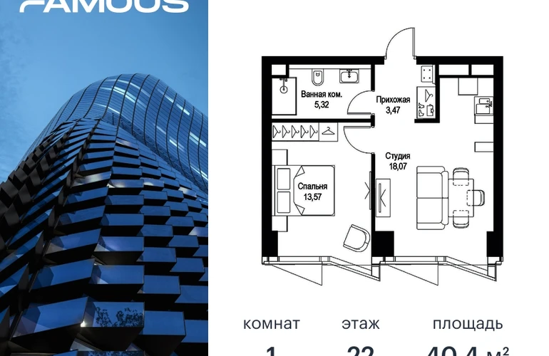 Прямая продажа от застройщика. Продаётся 1-к квартира общей площадью 40.40 кв. м с предчистовой отделкой на 22-м этаже премиального небоскреба Famous. Срок ввода в эксплуатацию - IV кв. 2024 г. Выдача ключей - II кв. 2025 г. Если к слову «будущее» подобрать архитектурный синоним, им непременно станет премиальный небоскреб Famous. Он расположен в закрытом квартале «Фили Сити» – настоящем городе в городе, окруженном зеленым ореолом из аллей и скверов, с инфраструктурой для жизни и отдыха самых взыскательных горожан. Резидентов Famous ждет особая привилегия – открывающиеся из окон бескрайние панорамы, с видами на парк Фили, Поклонную гору, Москва-реку и Москва-Сити. Эффектный ультрасовременный 57-этажный небоскреб, пластичный в нижней части, наверху трансформируется и взмывает ввысь выразительной скульптурой с обтекаемой поверхностью. Фасад украшенный стеклянными эркерами в виде прямых треугольных призм, словно олицетворяет собой идеально собранный пазл. Это безупречное решение для тех, кто не боится лидерства и высоты, не ищет простых путей, держит высокую планку во всем, не останавливается на достигнутом и живет в ритме мегаполиса. Не зря логотип Famous украшает графический элемент Триумфальной арки на Кутузовском проспекте – символ успеха и жизненных побед. Особенности дома: • Проект премиум-класса рядом с центром Москвы • Футуристическая авторская архитектура от бюро ADM • Ультрасовременные инженерные решения современных небоскрёбов • Элегантное решение орнаментальной композиции фасада от бюро ADM • Famous станет первым проектом в Москве с интерьерами лобби от международной архитектурной компании A ++ • Панорамное остекление по всему фасаду, головокружительные виды на достопримечательности Москвы, парк Фили, Москва-Сити и Поклонную гору • Европейский подход к благоустройству: площадь с фонтанами, парк-променад, детские и спортивные площадки, зоны отдыха • Продуманная концепция инфраструктуры: уютные кафе и рестораны, супермаркет, фитнес-студия, службы сервиса, детский центр развития • Эргономичные планировки от бюро Олега Клодта Транспортная доступность: • Удобный выезд на Кутузовский проспект и ТТК • В пешей доступности станции метро «Фили», «Багратионовская» и «Парк Победы» Компания MR Group предлагает своим клиентам специальные условия приобретения квартир в рамках программ ипотечного кредитования от банков-партнеров.О застройщике