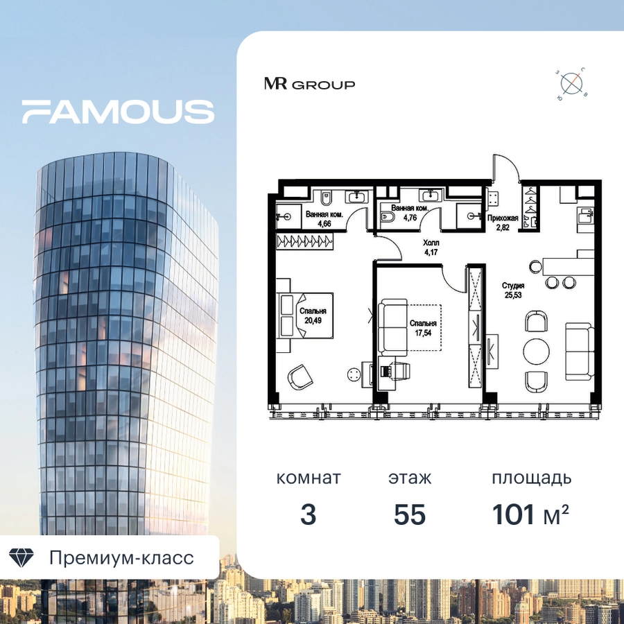 Прямая продажа от застройщика. Продаётся 3-к квартира общей площадью 101.09 кв. м с предчистовой отделкой на 55-м этаже премиального небоскреба Famous. Срок ввода в эксплуатацию - IV кв. 2024 г. Выдача ключей - II кв. 2025 г. Если к слову «будущее» подобрать архитектурный синоним, им непременно станет премиальный небоскреб Famous. Он расположен в закрытом квартале «Фили Сити» – настоящем городе в городе, окруженном зеленым ореолом из аллей и скверов, с инфраструктурой для жизни и отдыха самых взыскательных горожан. Резидентов Famous ждет особая привилегия – открывающиеся из окон бескрайние панорамы, с видами на парк Фили, Поклонную гору, Москва-реку и Москва-Сити. Эффектный ультрасовременный 57-этажный небоскреб, пластичный в нижней части, наверху трансформируется и взмывает ввысь выразительной скульптурой с обтекаемой поверхностью. Фасад украшенный стеклянными эркерами в виде прямых треугольных призм, словно олицетворяет собой идеально собранный пазл. Это безупречное решение для тех, кто не боится лидерства и высоты, не ищет простых путей, держит высокую планку во всем, не останавливается на достигнутом и живет в ритме мегаполиса. Не зря логотип Famous украшает графический элемент Триумфальной арки на Кутузовском проспекте – символ успеха и жизненных побед. Особенности дома: • Проект премиум-класса рядом с центром Москвы • Футуристическая авторская архитектура от бюро ADM • Ультрасовременные инженерные решения современных небоскрёбов • Элегантное решение орнаментальной композиции фасада от бюро ADM • Famous станет первым проектом в Москве с интерьерами лобби от международной архитектурной компании A ++ • Панорамное остекление по всему фасаду, головокружительные виды на достопримечательности Москвы, парк Фили, Москва-Сити и Поклонную гору • Европейский подход к благоустройству: площадь с фонтанами, парк-променад, детские и спортивные площадки, зоны отдыха • Продуманная концепция инфраструктуры: уютные кафе и рестораны, супермаркет, фитнес-студия, службы сервиса, детский центр развития • Эргономичные планировки от бюро Олега Клодта Транспортная доступность: • Удобный выезд на Кутузовский проспект и ТТК • В пешей доступности станции метро «Фили», «Багратионовская» и «Парк Победы» Компания MR Group предлагает своим клиентам специальные условия приобретения квартир в рамках программ ипотечного кредитования от банков-партнеров.О застройщике