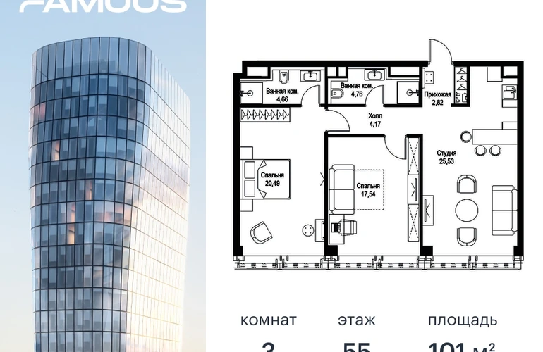 Прямая продажа от застройщика. Продаётся 3-к квартира общей площадью 101.09 кв. м с предчистовой отделкой на 55-м этаже премиального небоскреба Famous. Срок ввода в эксплуатацию - IV кв. 2024 г. Выдача ключей - II кв. 2025 г. Если к слову «будущее» подобрать архитектурный синоним, им непременно станет премиальный небоскреб Famous. Он расположен в закрытом квартале «Фили Сити» – настоящем городе в городе, окруженном зеленым ореолом из аллей и скверов, с инфраструктурой для жизни и отдыха самых взыскательных горожан. Резидентов Famous ждет особая привилегия – открывающиеся из окон бескрайние панорамы, с видами на парк Фили, Поклонную гору, Москва-реку и Москва-Сити. Эффектный ультрасовременный 57-этажный небоскреб, пластичный в нижней части, наверху трансформируется и взмывает ввысь выразительной скульптурой с обтекаемой поверхностью. Фасад украшенный стеклянными эркерами в виде прямых треугольных призм, словно олицетворяет собой идеально собранный пазл. Это безупречное решение для тех, кто не боится лидерства и высоты, не ищет простых путей, держит высокую планку во всем, не останавливается на достигнутом и живет в ритме мегаполиса. Не зря логотип Famous украшает графический элемент Триумфальной арки на Кутузовском проспекте – символ успеха и жизненных побед. Особенности дома: • Проект премиум-класса рядом с центром Москвы • Футуристическая авторская архитектура от бюро ADM • Ультрасовременные инженерные решения современных небоскрёбов • Элегантное решение орнаментальной композиции фасада от бюро ADM • Famous станет первым проектом в Москве с интерьерами лобби от международной архитектурной компании A ++ • Панорамное остекление по всему фасаду, головокружительные виды на достопримечательности Москвы, парк Фили, Москва-Сити и Поклонную гору • Европейский подход к благоустройству: площадь с фонтанами, парк-променад, детские и спортивные площадки, зоны отдыха • Продуманная концепция инфраструктуры: уютные кафе и рестораны, супермаркет, фитнес-студия, службы сервиса, детский центр развития • Эргономичные планировки от бюро Олега Клодта Транспортная доступность: • Удобный выезд на Кутузовский проспект и ТТК • В пешей доступности станции метро «Фили», «Багратионовская» и «Парк Победы» Компания MR Group предлагает своим клиентам специальные условия приобретения квартир в рамках программ ипотечного кредитования от банков-партнеров.О застройщике