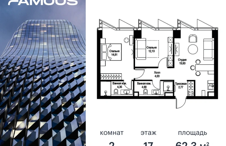Прямая продажа от застройщика. Продаётся 2-к квартира общей площадью 62.34 кв. м с предчистовой отделкой на 17-м этаже премиального небоскреба Famous. Срок ввода в эксплуатацию - IV кв. 2024 г. Выдача ключей - II кв. 2025 г. Если к слову «будущее» подобрать архитектурный синоним, им непременно станет премиальный небоскреб Famous. Он расположен в закрытом квартале «Фили Сити» – настоящем городе в городе, окруженном зеленым ореолом из аллей и скверов, с инфраструктурой для жизни и отдыха самых взыскательных горожан. Резидентов Famous ждет особая привилегия – открывающиеся из окон бескрайние панорамы, с видами на парк Фили, Поклонную гору, Москва-реку и Москва-Сити. Эффектный ультрасовременный 57-этажный небоскреб, пластичный в нижней части, наверху трансформируется и взмывает ввысь выразительной скульптурой с обтекаемой поверхностью. Фасад украшенный стеклянными эркерами в виде прямых треугольных призм, словно олицетворяет собой идеально собранный пазл. Это безупречное решение для тех, кто не боится лидерства и высоты, не ищет простых путей, держит высокую планку во всем, не останавливается на достигнутом и живет в ритме мегаполиса. Не зря логотип Famous украшает графический элемент Триумфальной арки на Кутузовском проспекте – символ успеха и жизненных побед. Особенности дома: • Проект премиум-класса рядом с центром Москвы • Футуристическая авторская архитектура от бюро ADM • Ультрасовременные инженерные решения современных небоскрёбов • Элегантное решение орнаментальной композиции фасада от бюро ADM • Famous станет первым проектом в Москве с интерьерами лобби от международной архитектурной компании A ++ • Панорамное остекление по всему фасаду, головокружительные виды на достопримечательности Москвы, парк Фили, Москва-Сити и Поклонную гору • Европейский подход к благоустройству: площадь с фонтанами, парк-променад, детские и спортивные площадки, зоны отдыха • Продуманная концепция инфраструктуры: уютные кафе и рестораны, супермаркет, фитнес-студия, службы сервиса, детский центр развития • Эргономичные планировки от бюро Олега Клодта Транспортная доступность: • Удобный выезд на Кутузовский проспект и ТТК • В пешей доступности станции метро «Фили», «Багратионовская» и «Парк Победы» Компания MR Group предлагает своим клиентам специальные условия приобретения квартир в рамках программ ипотечного кредитования от банков-партнеров.О застройщике