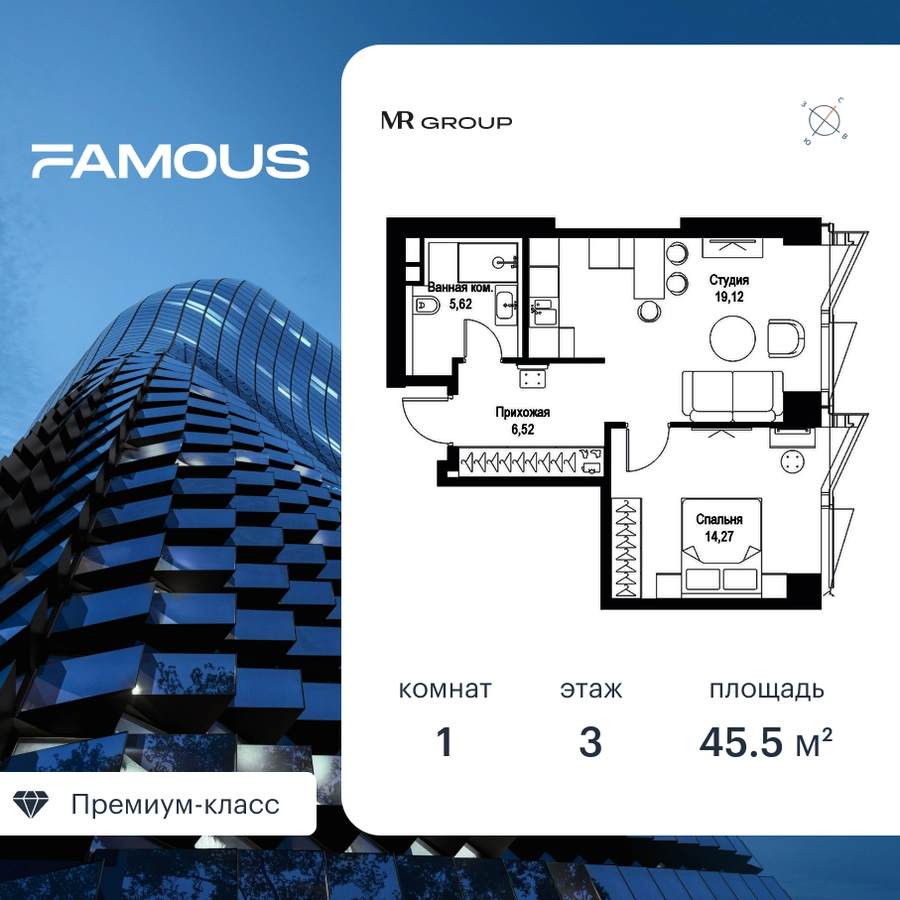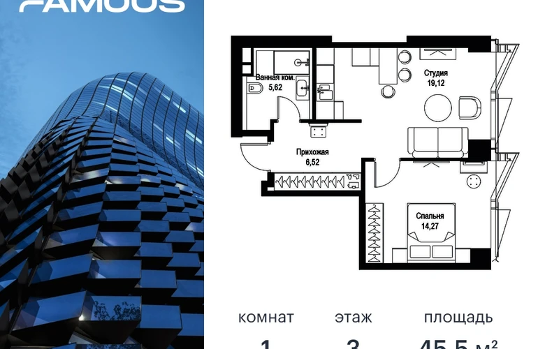 Прямая продажа от застройщика. Продаётся 1-к квартира общей площадью 45.53 кв. м с предчистовой отделкой на 3-м этаже премиального небоскреба Famous. Срок ввода в эксплуатацию - IV кв. 2024 г. Выдача ключей - II кв. 2025 г. Если к слову «будущее» подобрать архитектурный синоним, им непременно станет премиальный небоскреб Famous. Он расположен в закрытом квартале «Фили Сити» – настоящем городе в городе, окруженном зеленым ореолом из аллей и скверов, с инфраструктурой для жизни и отдыха самых взыскательных горожан. Резидентов Famous ждет особая привилегия – открывающиеся из окон бескрайние панорамы, с видами на парк Фили, Поклонную гору, Москва-реку и Москва-Сити. Эффектный ультрасовременный 57-этажный небоскреб, пластичный в нижней части, наверху трансформируется и взмывает ввысь выразительной скульптурой с обтекаемой поверхностью. Фасад украшенный стеклянными эркерами в виде прямых треугольных призм, словно олицетворяет собой идеально собранный пазл. Это безупречное решение для тех, кто не боится лидерства и высоты, не ищет простых путей, держит высокую планку во всем, не останавливается на достигнутом и живет в ритме мегаполиса. Не зря логотип Famous украшает графический элемент Триумфальной арки на Кутузовском проспекте – символ успеха и жизненных побед. Особенности дома: • Проект премиум-класса рядом с центром Москвы • Футуристическая авторская архитектура от бюро ADM • Ультрасовременные инженерные решения современных небоскрёбов • Элегантное решение орнаментальной композиции фасада от бюро ADM • Famous станет первым проектом в Москве с интерьерами лобби от международной архитектурной компании A ++ • Панорамное остекление по всему фасаду, головокружительные виды на достопримечательности Москвы, парк Фили, Москва-Сити и Поклонную гору • Европейский подход к благоустройству: площадь с фонтанами, парк-променад, детские и спортивные площадки, зоны отдыха • Продуманная концепция инфраструктуры: уютные кафе и рестораны, супермаркет, фитнес-студия, службы сервиса, детский центр развития • Эргономичные планировки от бюро Олега Клодта Транспортная доступность: • Удобный выезд на Кутузовский проспект и ТТК • В пешей доступности станции метро «Фили», «Багратионовская» и «Парк Победы» Компания MR Group предлагает своим клиентам специальные условия приобретения квартир в рамках программ ипотечного кредитования от банков-партнеров.О застройщике