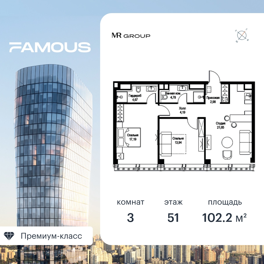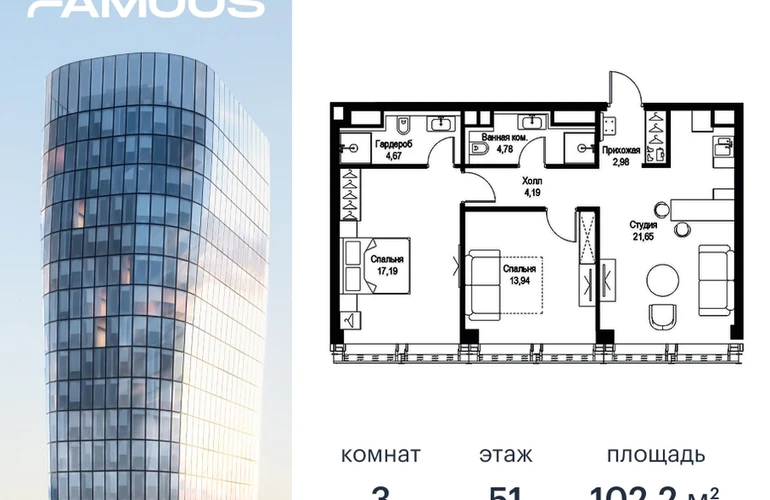 Прямая продажа от застройщика. Продаётся 3-к квартира общей площадью 102.22 кв. м с предчистовой отделкой на 51-м этаже премиального небоскреба Famous. Срок ввода в эксплуатацию - IV кв. 2024 г. Выдача ключей - II кв. 2025 г. Если к слову «будущее» подобрать архитектурный синоним, им непременно станет премиальный небоскреб Famous. Он расположен в закрытом квартале «Фили Сити» – настоящем городе в городе, окруженном зеленым ореолом из аллей и скверов, с инфраструктурой для жизни и отдыха самых взыскательных горожан. Резидентов Famous ждет особая привилегия – открывающиеся из окон бескрайние панорамы, с видами на парк Фили, Поклонную гору, Москва-реку и Москва-Сити. Эффектный ультрасовременный 57-этажный небоскреб, пластичный в нижней части, наверху трансформируется и взмывает ввысь выразительной скульптурой с обтекаемой поверхностью. Фасад украшенный стеклянными эркерами в виде прямых треугольных призм, словно олицетворяет собой идеально собранный пазл. Это безупречное решение для тех, кто не боится лидерства и высоты, не ищет простых путей, держит высокую планку во всем, не останавливается на достигнутом и живет в ритме мегаполиса. Не зря логотип Famous украшает графический элемент Триумфальной арки на Кутузовском проспекте – символ успеха и жизненных побед. Особенности дома: • Проект премиум-класса рядом с центром Москвы • Футуристическая авторская архитектура от бюро ADM • Ультрасовременные инженерные решения современных небоскрёбов • Элегантное решение орнаментальной композиции фасада от бюро ADM • Famous станет первым проектом в Москве с интерьерами лобби от международной архитектурной компании A ++ • Панорамное остекление по всему фасаду, головокружительные виды на достопримечательности Москвы, парк Фили, Москва-Сити и Поклонную гору • Европейский подход к благоустройству: площадь с фонтанами, парк-променад, детские и спортивные площадки, зоны отдыха • Продуманная концепция инфраструктуры: уютные кафе и рестораны, супермаркет, фитнес-студия, службы сервиса, детский центр развития • Эргономичные планировки от бюро Олега Клодта Транспортная доступность: • Удобный выезд на Кутузовский проспект и ТТК • В пешей доступности станции метро «Фили», «Багратионовская» и «Парк Победы» Компания MR Group предлагает своим клиентам специальные условия приобретения квартир в рамках программ ипотечного кредитования от банков-партнеров.О застройщике
