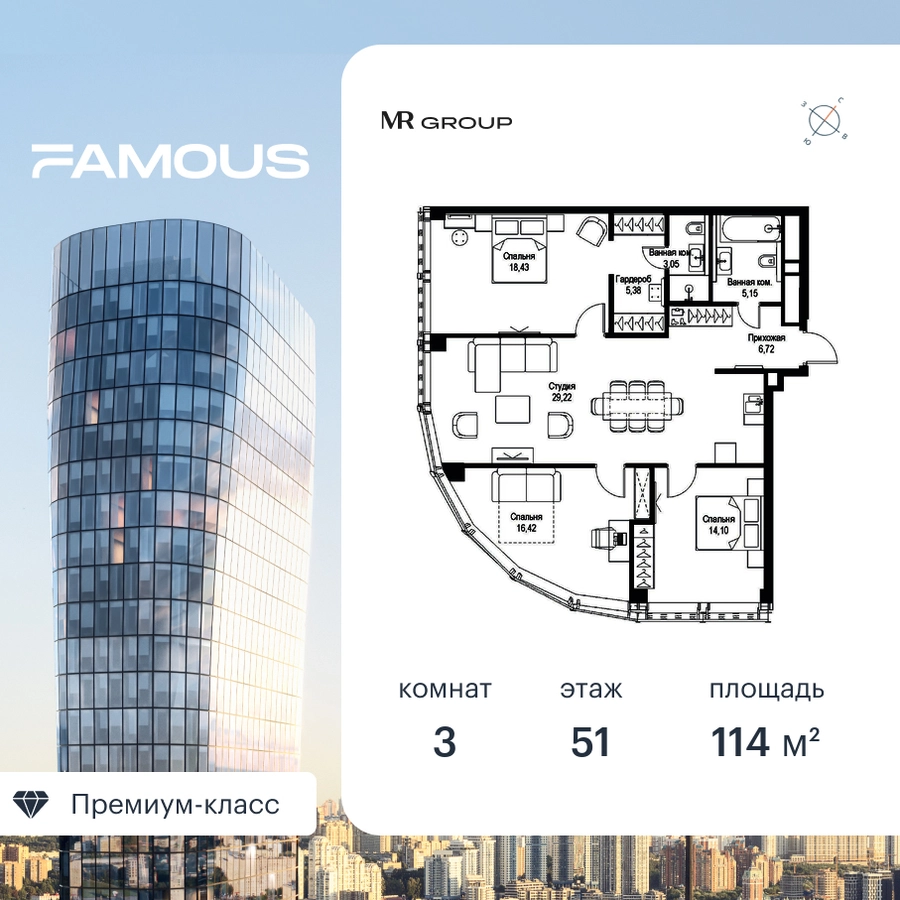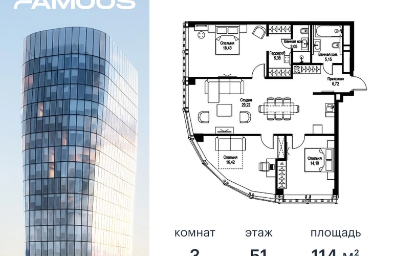 Прямая продажа от застройщика. Продаётся 3-к квартира общей площадью 114.02 кв. м с предчистовой отделкой на 51-м этаже премиального небоскреба Famous. Срок ввода в эксплуатацию - IV кв. 2024 г. Выдача ключей - II кв. 2025 г. Если к слову «будущее» подобрать архитектурный синоним, им непременно станет премиальный небоскреб Famous. Он расположен в закрытом квартале «Фили Сити» – настоящем городе в городе, окруженном зеленым ореолом из аллей и скверов, с инфраструктурой для жизни и отдыха самых взыскательных горожан. Резидентов Famous ждет особая привилегия – открывающиеся из окон бескрайние панорамы, с видами на парк Фили, Поклонную гору, Москва-реку и Москва-Сити. Эффектный ультрасовременный 57-этажный небоскреб, пластичный в нижней части, наверху трансформируется и взмывает ввысь выразительной скульптурой с обтекаемой поверхностью. Фасад украшенный стеклянными эркерами в виде прямых треугольных призм, словно олицетворяет собой идеально собранный пазл. Это безупречное решение для тех, кто не боится лидерства и высоты, не ищет простых путей, держит высокую планку во всем, не останавливается на достигнутом и живет в ритме мегаполиса. Не зря логотип Famous украшает графический элемент Триумфальной арки на Кутузовском проспекте – символ успеха и жизненных побед. Особенности дома: • Проект премиум-класса рядом с центром Москвы • Футуристическая авторская архитектура от бюро ADM • Ультрасовременные инженерные решения современных небоскрёбов • Элегантное решение орнаментальной композиции фасада от бюро ADM • Famous станет первым проектом в Москве с интерьерами лобби от международной архитектурной компании A ++ • Панорамное остекление по всему фасаду, головокружительные виды на достопримечательности Москвы, парк Фили, Москва-Сити и Поклонную гору • Европейский подход к благоустройству: площадь с фонтанами, парк-променад, детские и спортивные площадки, зоны отдыха • Продуманная концепция инфраструктуры: уютные кафе и рестораны, супермаркет, фитнес-студия, службы сервиса, детский центр развития • Эргономичные планировки от бюро Олега Клодта Транспортная доступность: • Удобный выезд на Кутузовский проспект и ТТК • В пешей доступности станции метро «Фили», «Багратионовская» и «Парк Победы» Компания MR Group предлагает своим клиентам специальные условия приобретения квартир в рамках программ ипотечного кредитования от банков-партнеров.О застройщике