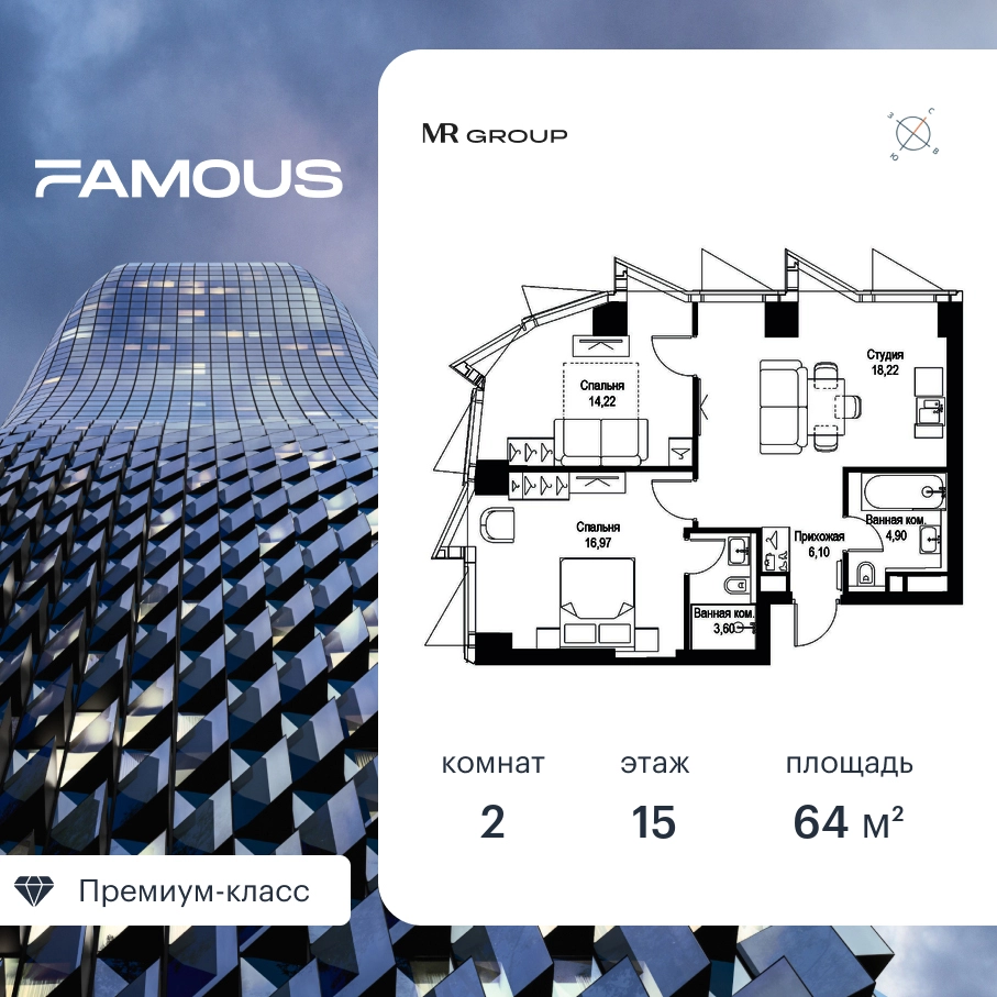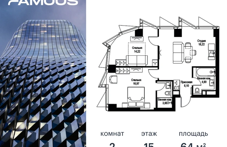 Прямая продажа от застройщика. Продаётся 2-к квартира общей площадью 64.01 кв. м с предчистовой отделкой на 15-м этаже премиального небоскреба Famous. Срок ввода в эксплуатацию - IV кв. 2024 г. Выдача ключей - II кв. 2025 г. Если к слову «будущее» подобрать архитектурный синоним, им непременно станет премиальный небоскреб Famous. Он расположен в закрытом квартале «Фили Сити» – настоящем городе в городе, окруженном зеленым ореолом из аллей и скверов, с инфраструктурой для жизни и отдыха самых взыскательных горожан. Резидентов Famous ждет особая привилегия – открывающиеся из окон бескрайние панорамы, с видами на парк Фили, Поклонную гору, Москва-реку и Москва-Сити. Эффектный ультрасовременный 57-этажный небоскреб, пластичный в нижней части, наверху трансформируется и взмывает ввысь выразительной скульптурой с обтекаемой поверхностью. Фасад украшенный стеклянными эркерами в виде прямых треугольных призм, словно олицетворяет собой идеально собранный пазл. Это безупречное решение для тех, кто не боится лидерства и высоты, не ищет простых путей, держит высокую планку во всем, не останавливается на достигнутом и живет в ритме мегаполиса. Не зря логотип Famous украшает графический элемент Триумфальной арки на Кутузовском проспекте – символ успеха и жизненных побед. Особенности дома: • Проект премиум-класса рядом с центром Москвы • Футуристическая авторская архитектура от бюро ADM • Ультрасовременные инженерные решения современных небоскрёбов • Элегантное решение орнаментальной композиции фасада от бюро ADM • Famous станет первым проектом в Москве с интерьерами лобби от международной архитектурной компании A ++ • Панорамное остекление по всему фасаду, головокружительные виды на достопримечательности Москвы, парк Фили, Москва-Сити и Поклонную гору • Европейский подход к благоустройству: площадь с фонтанами, парк-променад, детские и спортивные площадки, зоны отдыха • Продуманная концепция инфраструктуры: уютные кафе и рестораны, супермаркет, фитнес-студия, службы сервиса, детский центр развития • Эргономичные планировки от бюро Олега Клодта Транспортная доступность: • Удобный выезд на Кутузовский проспект и ТТК • В пешей доступности станции метро «Фили», «Багратионовская» и «Парк Победы» Компания MR Group предлагает своим клиентам специальные условия приобретения квартир в рамках программ ипотечного кредитования от банков-партнеров.О застройщике