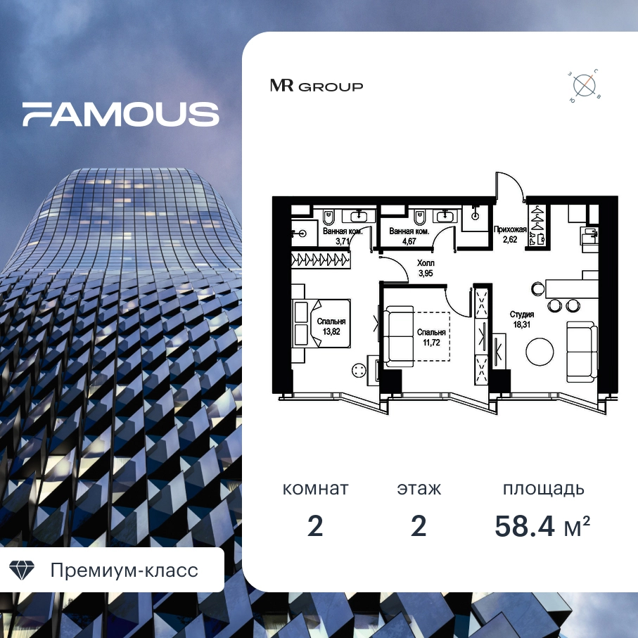 Прямая продажа от застройщика. Продаётся 2-к квартира общей площадью 58.48 кв. м с предчистовой отделкой на 2-м этаже премиального небоскреба Famous. Срок ввода в эксплуатацию - IV кв. 2024 г. Выдача ключей - II кв. 2025 г. Если к слову «будущее» подобрать архитектурный синоним, им непременно станет премиальный небоскреб Famous. Он расположен в закрытом квартале «Фили Сити» – настоящем городе в городе, окруженном зеленым ореолом из аллей и скверов, с инфраструктурой для жизни и отдыха самых взыскательных горожан. Резидентов Famous ждет особая привилегия – открывающиеся из окон бескрайние панорамы, с видами на парк Фили, Поклонную гору, Москва-реку и Москва-Сити. Эффектный ультрасовременный 57-этажный небоскреб, пластичный в нижней части, наверху трансформируется и взмывает ввысь выразительной скульптурой с обтекаемой поверхностью. Фасад украшенный стеклянными эркерами в виде прямых треугольных призм, словно олицетворяет собой идеально собранный пазл. Это безупречное решение для тех, кто не боится лидерства и высоты, не ищет простых путей, держит высокую планку во всем, не останавливается на достигнутом и живет в ритме мегаполиса. Не зря логотип Famous украшает графический элемент Триумфальной арки на Кутузовском проспекте – символ успеха и жизненных побед. Особенности дома: • Проект премиум-класса рядом с центром Москвы • Футуристическая авторская архитектура от бюро ADM • Ультрасовременные инженерные решения современных небоскрёбов • Элегантное решение орнаментальной композиции фасада от бюро ADM • Famous станет первым проектом в Москве с интерьерами лобби от международной архитектурной компании A ++ • Панорамное остекление по всему фасаду, головокружительные виды на достопримечательности Москвы, парк Фили, Москва-Сити и Поклонную гору • Европейский подход к благоустройству: площадь с фонтанами, парк-променад, детские и спортивные площадки, зоны отдыха • Продуманная концепция инфраструктуры: уютные кафе и рестораны, супермаркет, фитнес-студия, службы сервиса, детский центр развития • Эргономичные планировки от бюро Олега Клодта Транспортная доступность: • Удобный выезд на Кутузовский проспект и ТТК • В пешей доступности станции метро «Фили», «Багратионовская» и «Парк Победы» Компания MR Group предлагает своим клиентам специальные условия приобретения квартир в рамках программ ипотечного кредитования от банков-партнеров.О застройщике