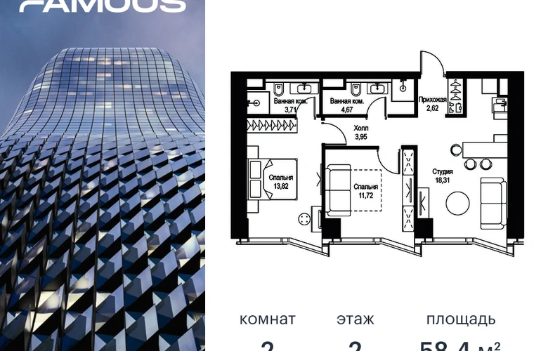 Прямая продажа от застройщика. Продаётся 2-к квартира общей площадью 58.48 кв. м с предчистовой отделкой на 2-м этаже премиального небоскреба Famous. Срок ввода в эксплуатацию - IV кв. 2024 г. Выдача ключей - II кв. 2025 г. Если к слову «будущее» подобрать архитектурный синоним, им непременно станет премиальный небоскреб Famous. Он расположен в закрытом квартале «Фили Сити» – настоящем городе в городе, окруженном зеленым ореолом из аллей и скверов, с инфраструктурой для жизни и отдыха самых взыскательных горожан. Резидентов Famous ждет особая привилегия – открывающиеся из окон бескрайние панорамы, с видами на парк Фили, Поклонную гору, Москва-реку и Москва-Сити. Эффектный ультрасовременный 57-этажный небоскреб, пластичный в нижней части, наверху трансформируется и взмывает ввысь выразительной скульптурой с обтекаемой поверхностью. Фасад украшенный стеклянными эркерами в виде прямых треугольных призм, словно олицетворяет собой идеально собранный пазл. Это безупречное решение для тех, кто не боится лидерства и высоты, не ищет простых путей, держит высокую планку во всем, не останавливается на достигнутом и живет в ритме мегаполиса. Не зря логотип Famous украшает графический элемент Триумфальной арки на Кутузовском проспекте – символ успеха и жизненных побед. Особенности дома: • Проект премиум-класса рядом с центром Москвы • Футуристическая авторская архитектура от бюро ADM • Ультрасовременные инженерные решения современных небоскрёбов • Элегантное решение орнаментальной композиции фасада от бюро ADM • Famous станет первым проектом в Москве с интерьерами лобби от международной архитектурной компании A ++ • Панорамное остекление по всему фасаду, головокружительные виды на достопримечательности Москвы, парк Фили, Москва-Сити и Поклонную гору • Европейский подход к благоустройству: площадь с фонтанами, парк-променад, детские и спортивные площадки, зоны отдыха • Продуманная концепция инфраструктуры: уютные кафе и рестораны, супермаркет, фитнес-студия, службы сервиса, детский центр развития • Эргономичные планировки от бюро Олега Клодта Транспортная доступность: • Удобный выезд на Кутузовский проспект и ТТК • В пешей доступности станции метро «Фили», «Багратионовская» и «Парк Победы» Компания MR Group предлагает своим клиентам специальные условия приобретения квартир в рамках программ ипотечного кредитования от банков-партнеров.О застройщике