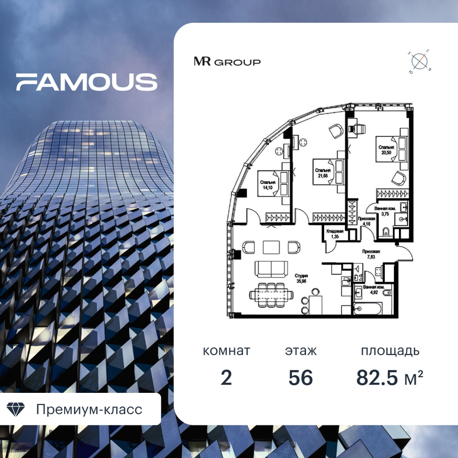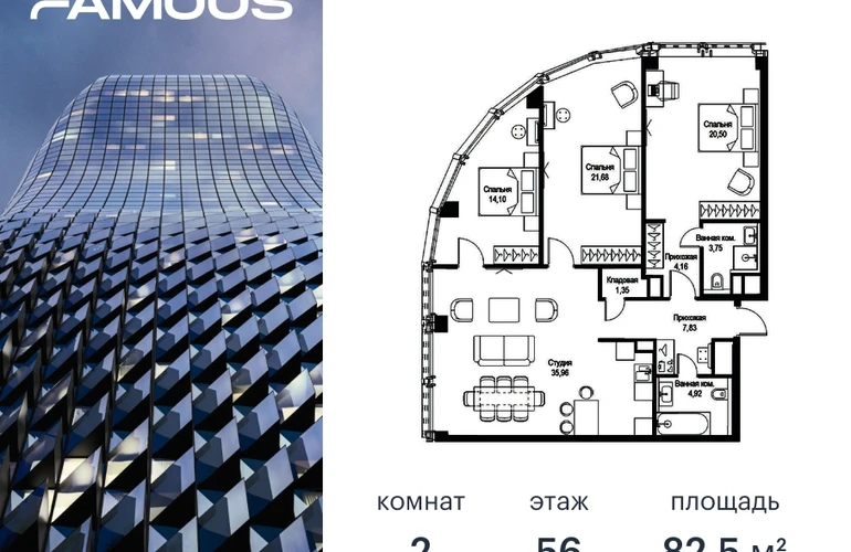 Прямая продажа от застройщика. Продаётся 2-к квартира общей площадью 82.57 кв. м с предчистовой отделкой на 56-м этаже премиального небоскреба Famous. Срок ввода в эксплуатацию - IV кв. 2024 г. Выдача ключей - II кв. 2025 г. Если к слову «будущее» подобрать архитектурный синоним, им непременно станет премиальный небоскреб Famous. Он расположен в закрытом квартале «Фили Сити» – настоящем городе в городе, окруженном зеленым ореолом из аллей и скверов, с инфраструктурой для жизни и отдыха самых взыскательных горожан. Резидентов Famous ждет особая привилегия – открывающиеся из окон бескрайние панорамы, с видами на парк Фили, Поклонную гору, Москва-реку и Москва-Сити. Эффектный ультрасовременный 57-этажный небоскреб, пластичный в нижней части, наверху трансформируется и взмывает ввысь выразительной скульптурой с обтекаемой поверхностью. Фасад украшенный стеклянными эркерами в виде прямых треугольных призм, словно олицетворяет собой идеально собранный пазл. Это безупречное решение для тех, кто не боится лидерства и высоты, не ищет простых путей, держит высокую планку во всем, не останавливается на достигнутом и живет в ритме мегаполиса. Не зря логотип Famous украшает графический элемент Триумфальной арки на Кутузовском проспекте – символ успеха и жизненных побед. Особенности дома: • Проект премиум-класса рядом с центром Москвы • Футуристическая авторская архитектура от бюро ADM • Ультрасовременные инженерные решения современных небоскрёбов • Элегантное решение орнаментальной композиции фасада от бюро ADM • Famous станет первым проектом в Москве с интерьерами лобби от международной архитектурной компании A ++ • Панорамное остекление по всему фасаду, головокружительные виды на достопримечательности Москвы, парк Фили, Москва-Сити и Поклонную гору • Европейский подход к благоустройству: площадь с фонтанами, парк-променад, детские и спортивные площадки, зоны отдыха • Продуманная концепция инфраструктуры: уютные кафе и рестораны, супермаркет, фитнес-студия, службы сервиса, детский центр развития • Эргономичные планировки от бюро Олега Клодта Транспортная доступность: • Удобный выезд на Кутузовский проспект и ТТК • В пешей доступности станции метро «Фили», «Багратионовская» и «Парк Победы» Компания MR Group предлагает своим клиентам специальные условия приобретения квартир в рамках программ ипотечного кредитования от банков-партнеров.О застройщике